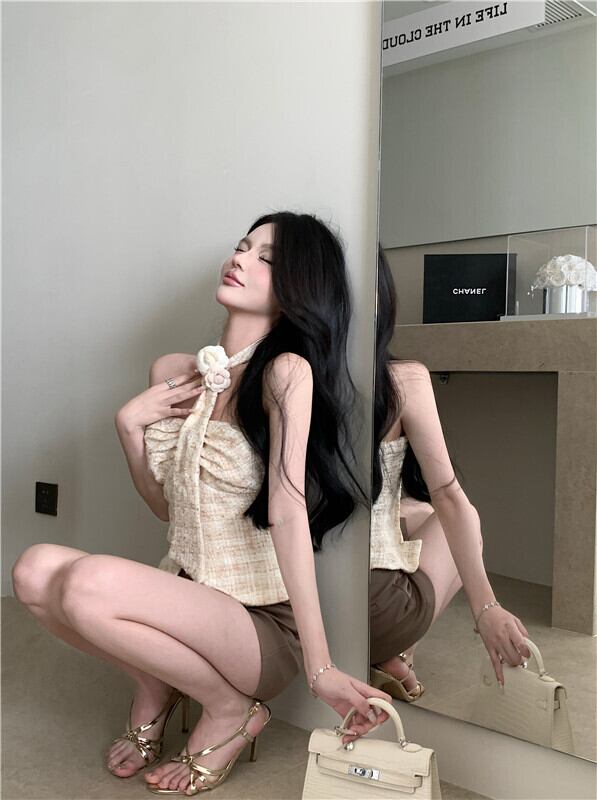 スイートホットガールスーツ夏立体装飾ホルターネックベストトップウエストショーツ 2 点セット 大人ガーリー スウィート キュート カジュアル サマー 夏物 ブルマー