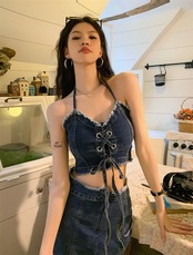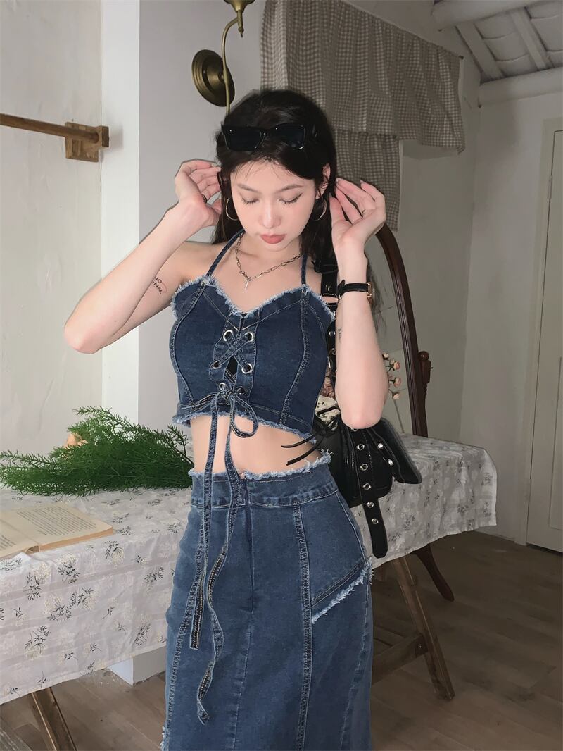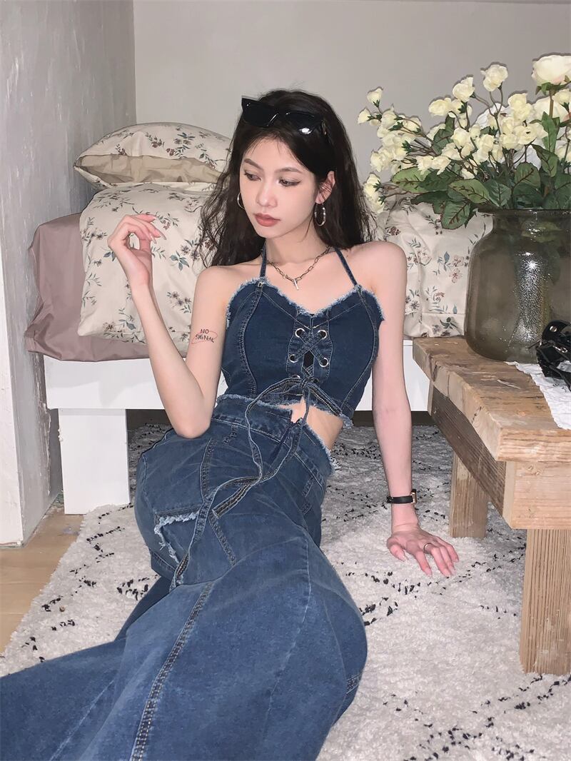 ホットガールスーツホルターネックデニムストラップタンクトップ夏ウエストファーエッジラップヒップロングスカートツーピースセット サマー 夏物