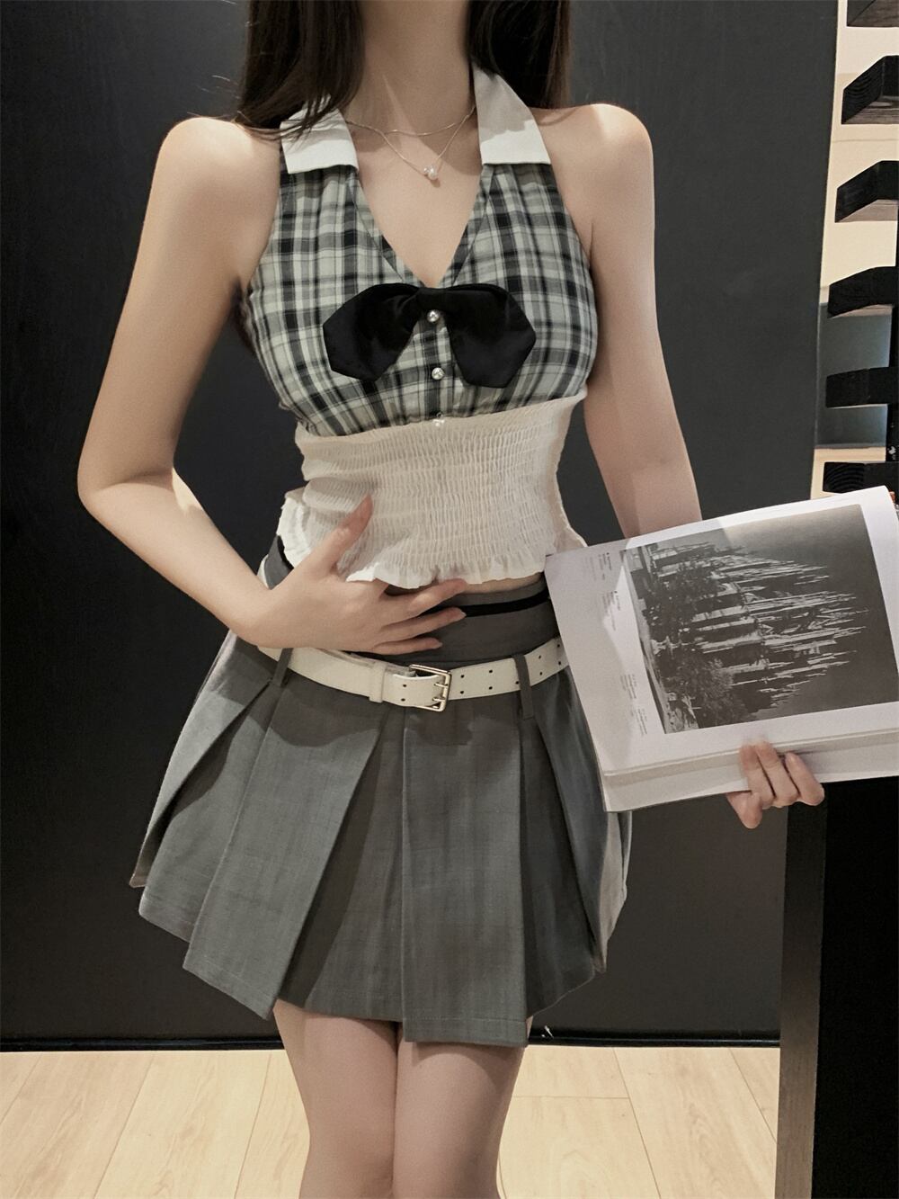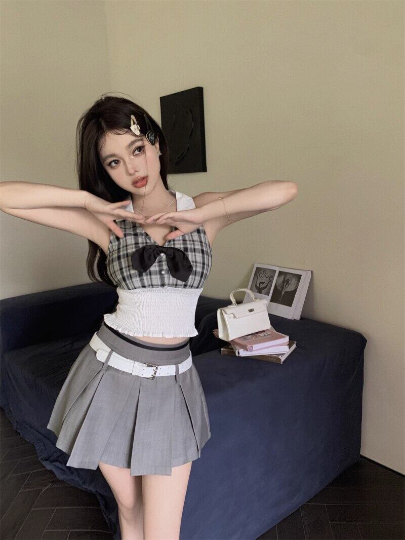 甘くてホットガールズセット夏コントラストチェック柄ノースリーブシャツ A ラインプリーツショートスカート 2 点セット服 大人ガーリー スウィート キュート カジュアル サマー 夏物 Aライン