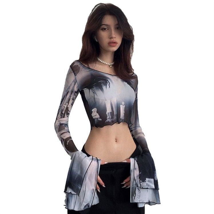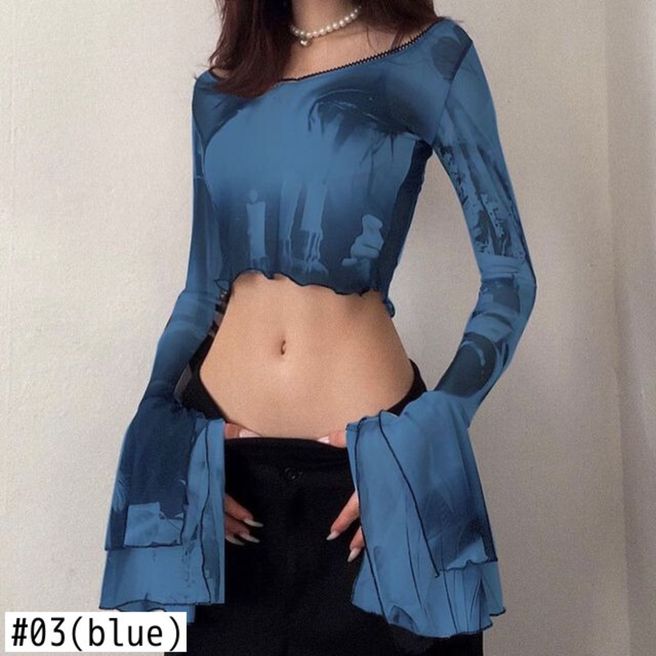 セクシープリント露出へそ日焼け防止長袖 Tシャツ夏ホットガールショートスリムフィットトップ服 ロング サマー 夏物