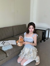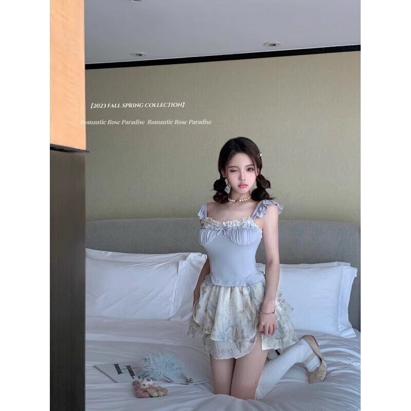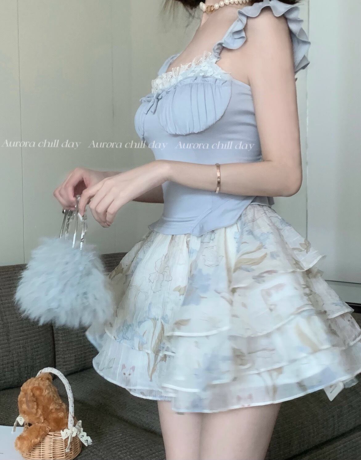甘いホットガールスーツ夏フライングスリーブフレンチ弾性スリムフィットトップシフォンフラワースカート 2 点セット エラスティック 伸縮 大人ガーリー スウィート キュート カジュアル サマー 夏物 フラワーデザイン
