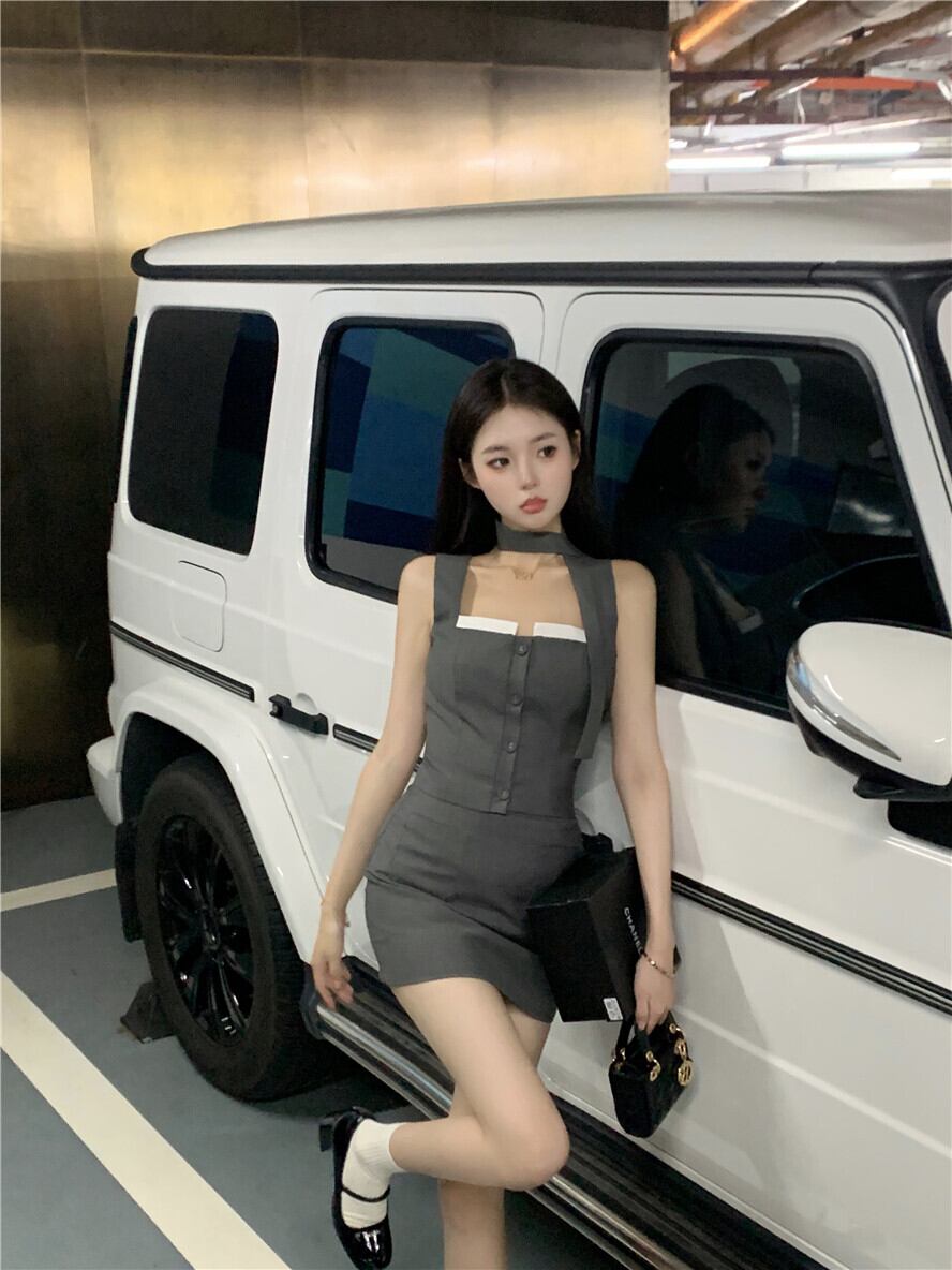 フレンチスタイルホットガールスーツ夏ノースリーブスプライシングサスペンダートップミニスカートツーピースセット服 サマー 夏物