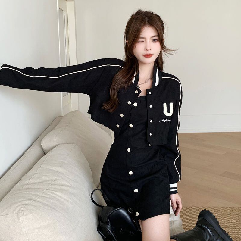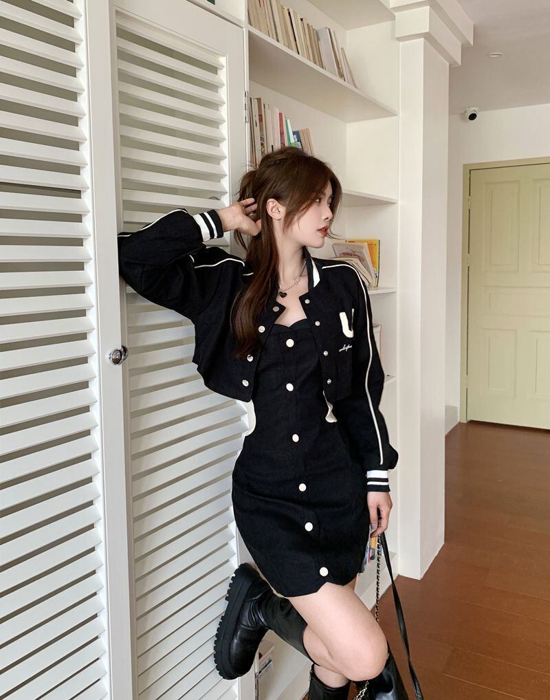 春/秋ブラックホットガールズスーツ野球コートストラップレススリムドレスツーピースセット服 スプリング 春物 オータム 秋物