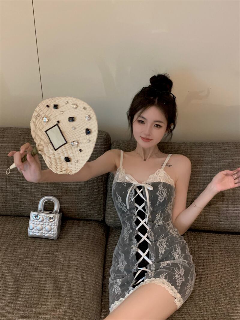 純粋セクシーレーススプライスドレス夏甘いホットガールスリムフィットレースアップラップヒップスパゲッティストラップドレス服 大人ガーリー スウィート キュート カジュアル サマー 夏物