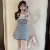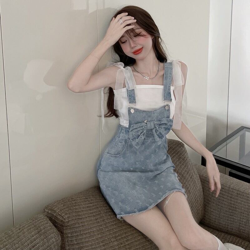 Sweet Girl サマースーツ レディース サスペンダー スクエアカラー スリム Clic デニム ストラップ ドレス ボトム シャツ トップ 2 点セット 大人ガーリー スウィート キュート カジュアル 夏物 スクウェア