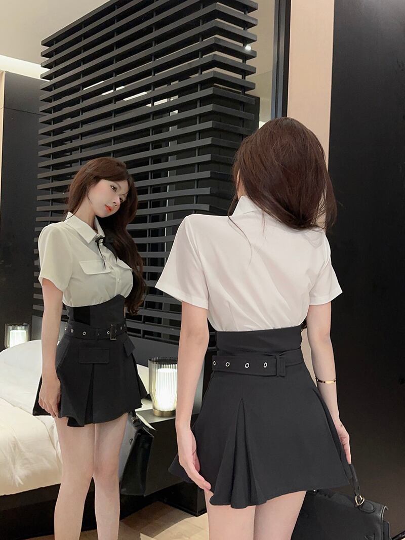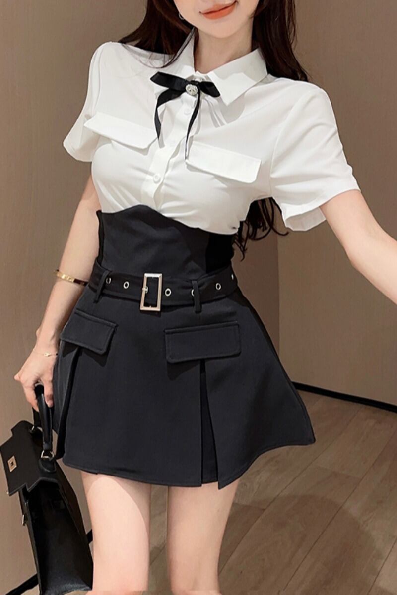 スタイルスイートガールスーツ夏半袖シャツスリムフィット A ラインプリーツミニスカート 2 点セット服 大人ガーリー スウィート キュート カジュアル サマー 夏物 Aライン