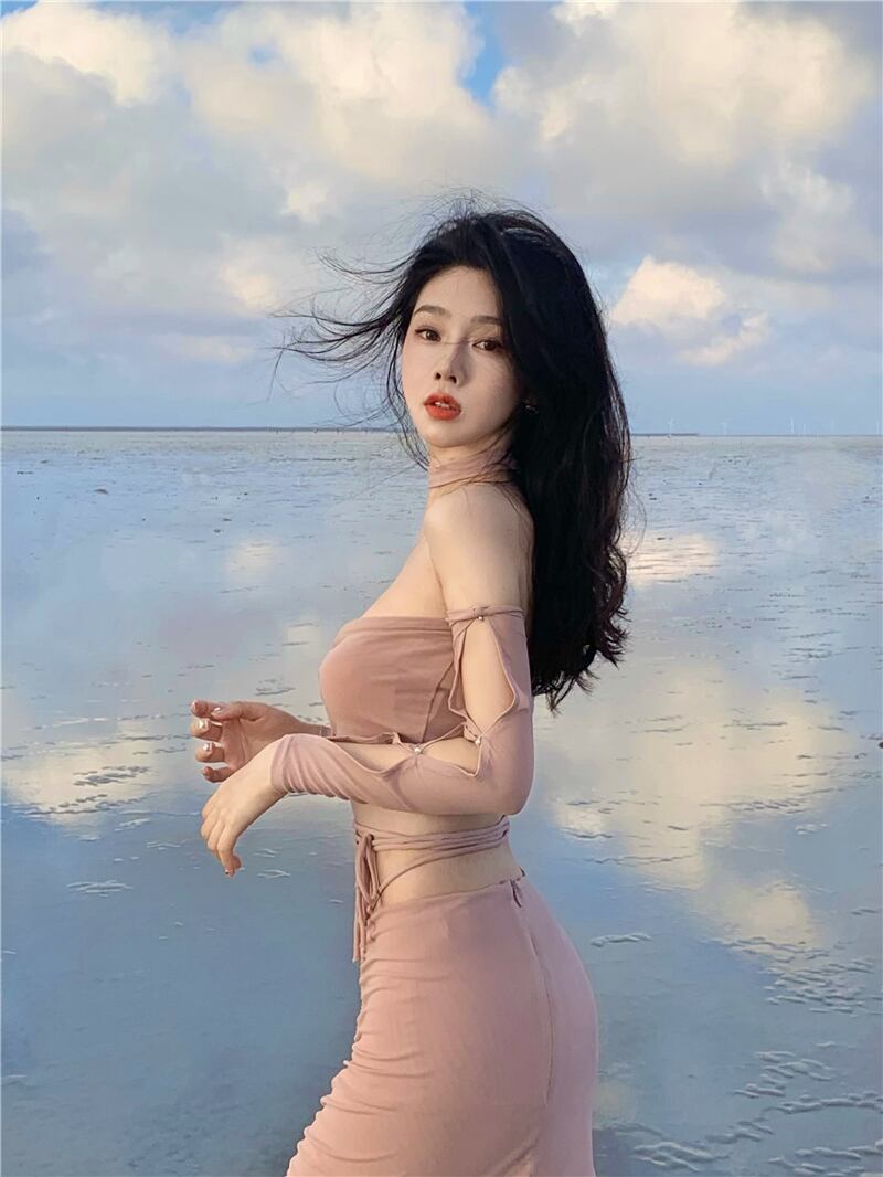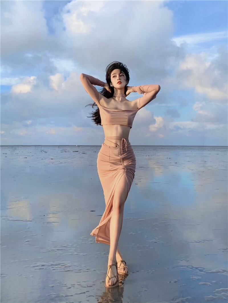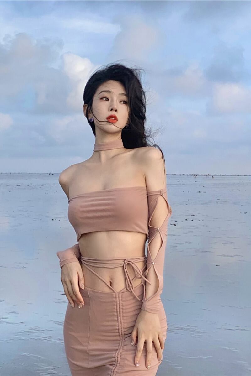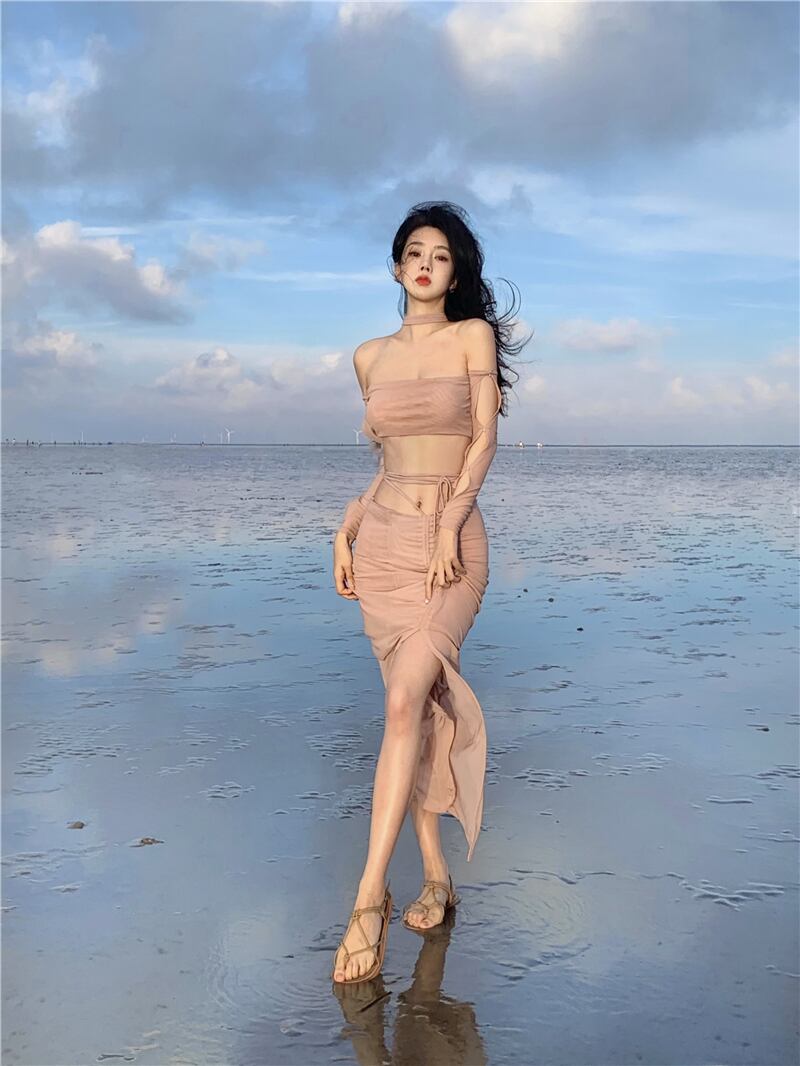 ホットガールスーツメッシュホルターネック中空アウト純粋長袖ショートトップストラップスプリットスカートツーピースセット服 ロング ピュア