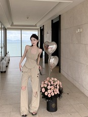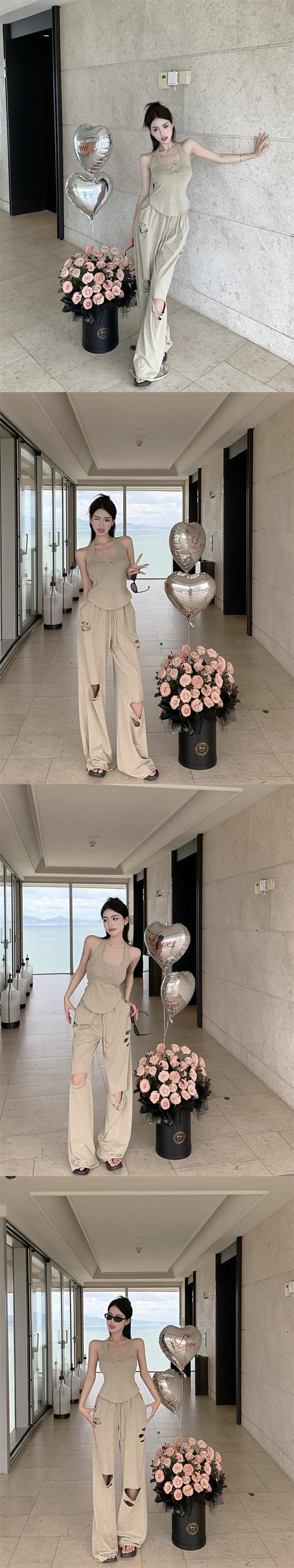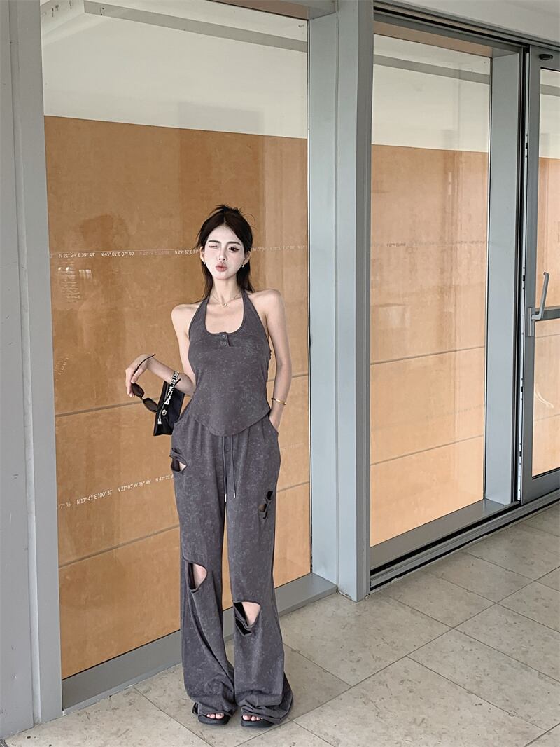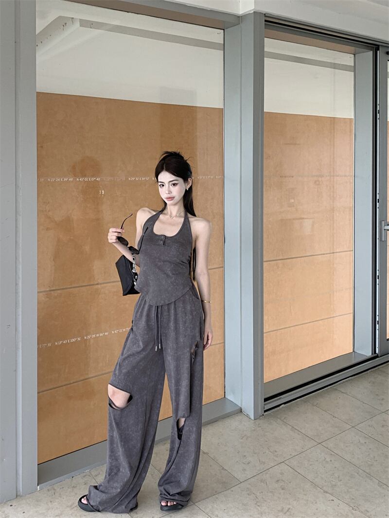 甘くてクールホットガールスーツ レディース 夏 ホルターネック ノースリーブ バックレス タンクトップ ウエスト ワイドレッグ パンツ 2点セット 大人ガーリー スウィート キュート カジュアル サマー 夏物 ワイドパンツ