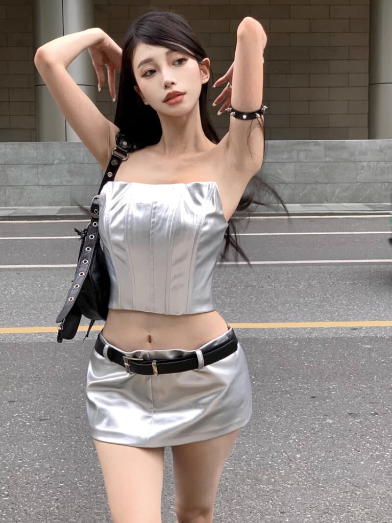 ホットガールズ夏フレンチスタイルスーツフィッシュボーンストラップレスベストセクシーラップヒップミニスカートツーピースセット服 サマー 夏物