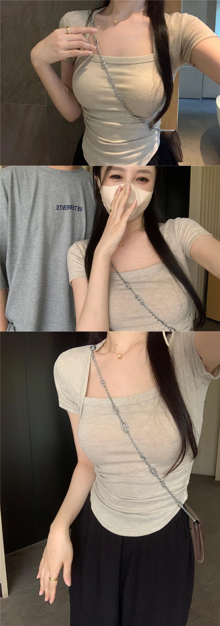 セクシーホットガールスクエアカラー半袖 Tシャツニッチ夏スリム不規則ウエストトップス用 サマー 夏物 スクウェア
