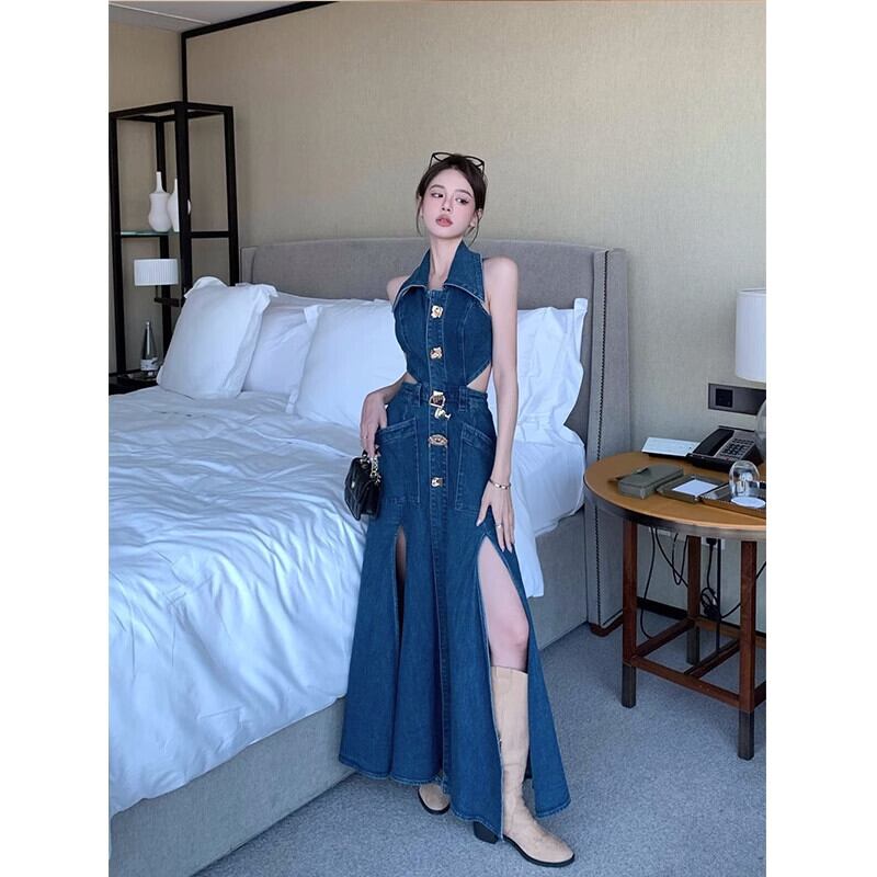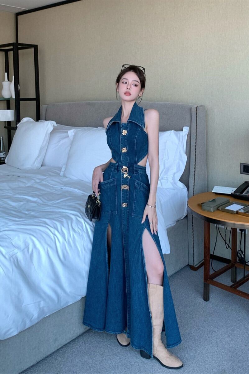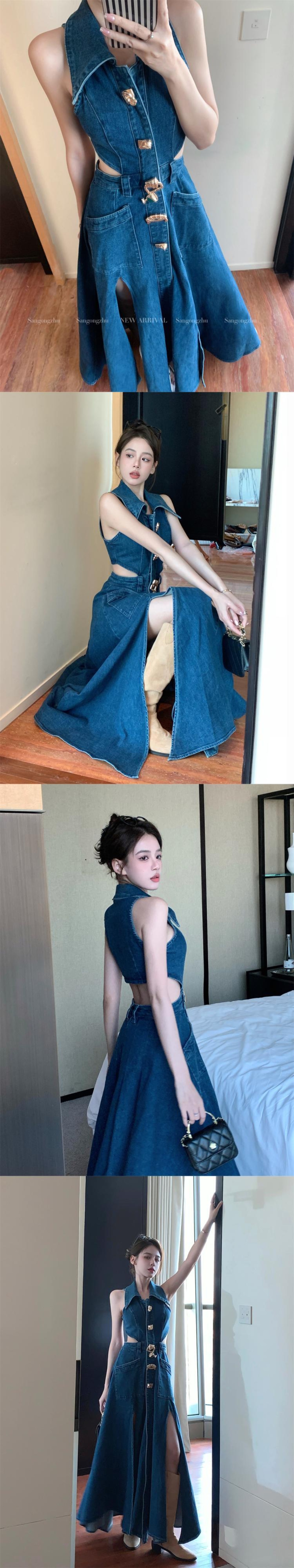 ターンダウンカラー中空アウトドレス夏ノースリーブスリムフィットスプリットデニムノースリーブドレス服 サマー 夏物
