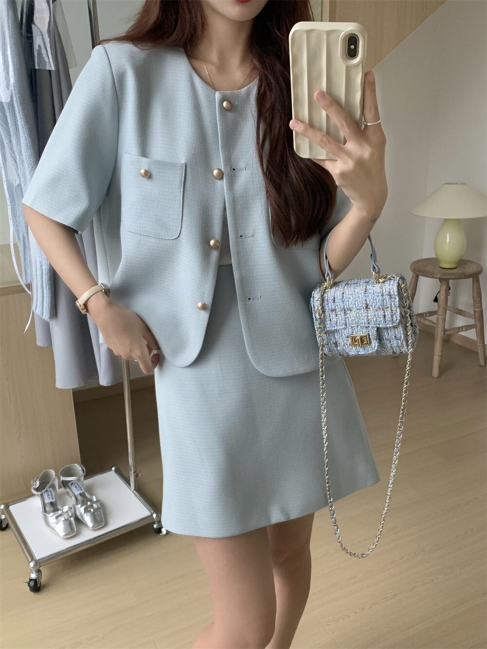 レトロオフィスレディスーツ夏ラウンドネック半袖コートウエストスカートツーピースセット服 サマー 夏物 Oネック 会社 学校 通勤や通学にも