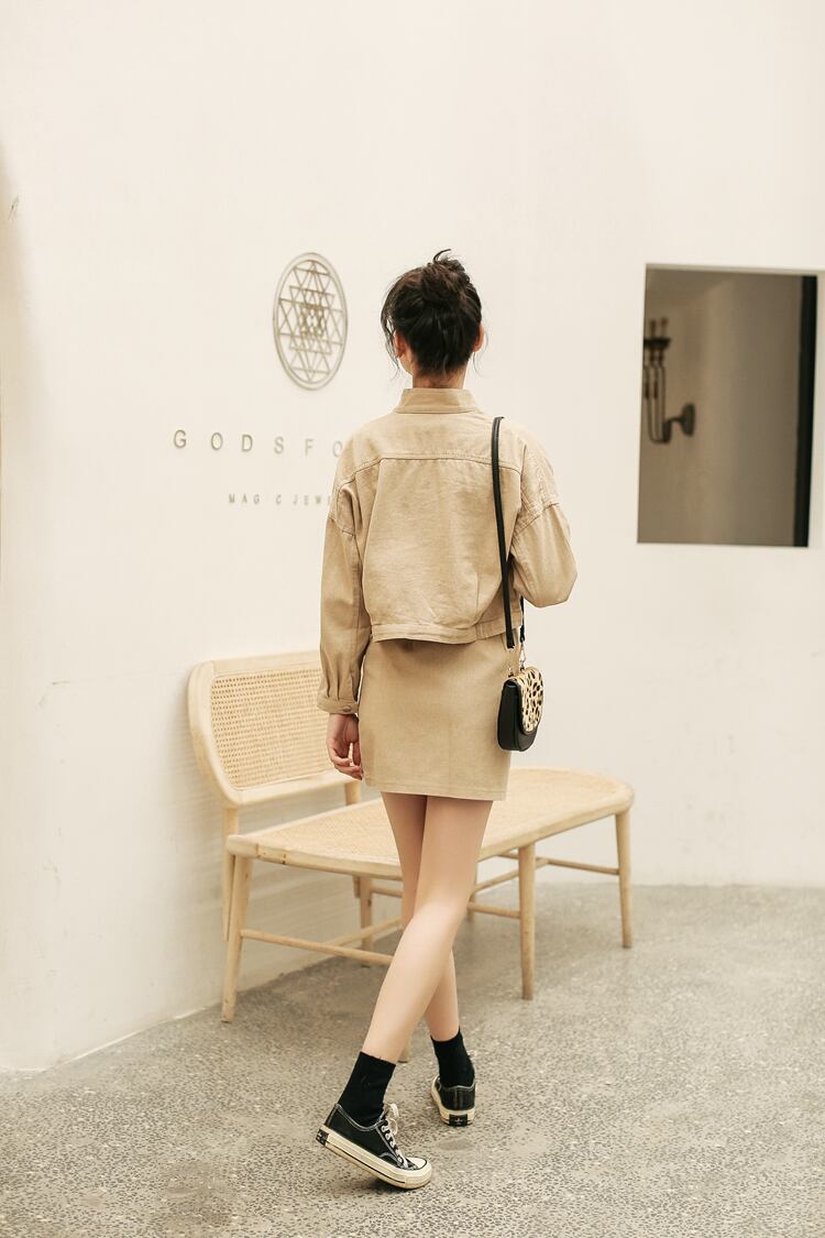 デニムスーツスカートカーキバットスリーブショートコートウエストヒップラップスカートスタイルツーピースセット服