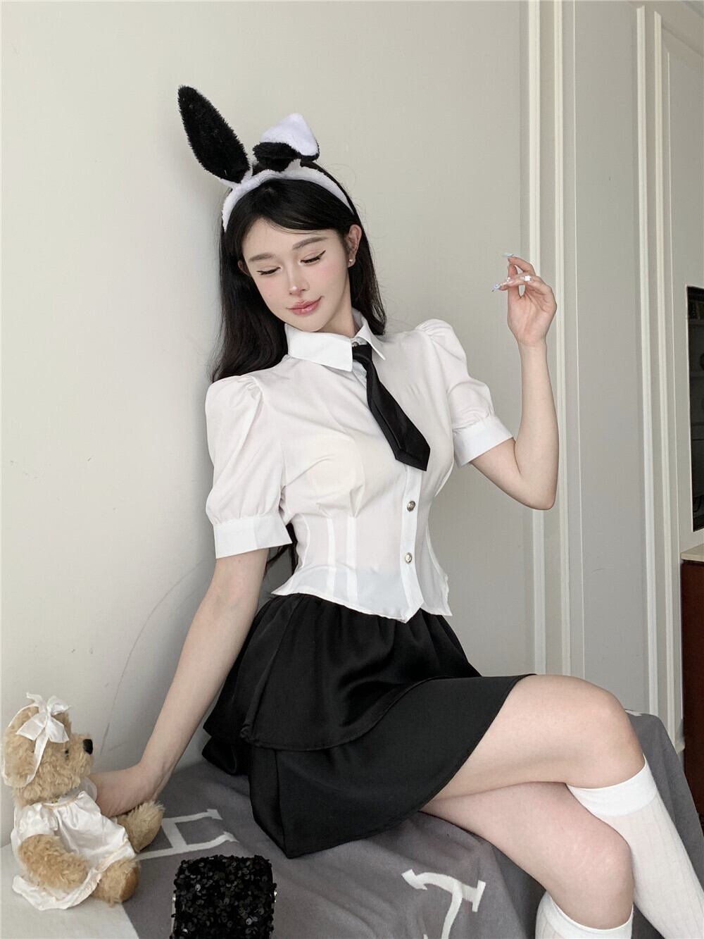 スイートガールスーツ レディース スリムフィット ショートバブルスリーブシャツ ネクタイ付き ふわふわショートスカート 2点セット服 大人ガーリー スウィート キュート カジュアル