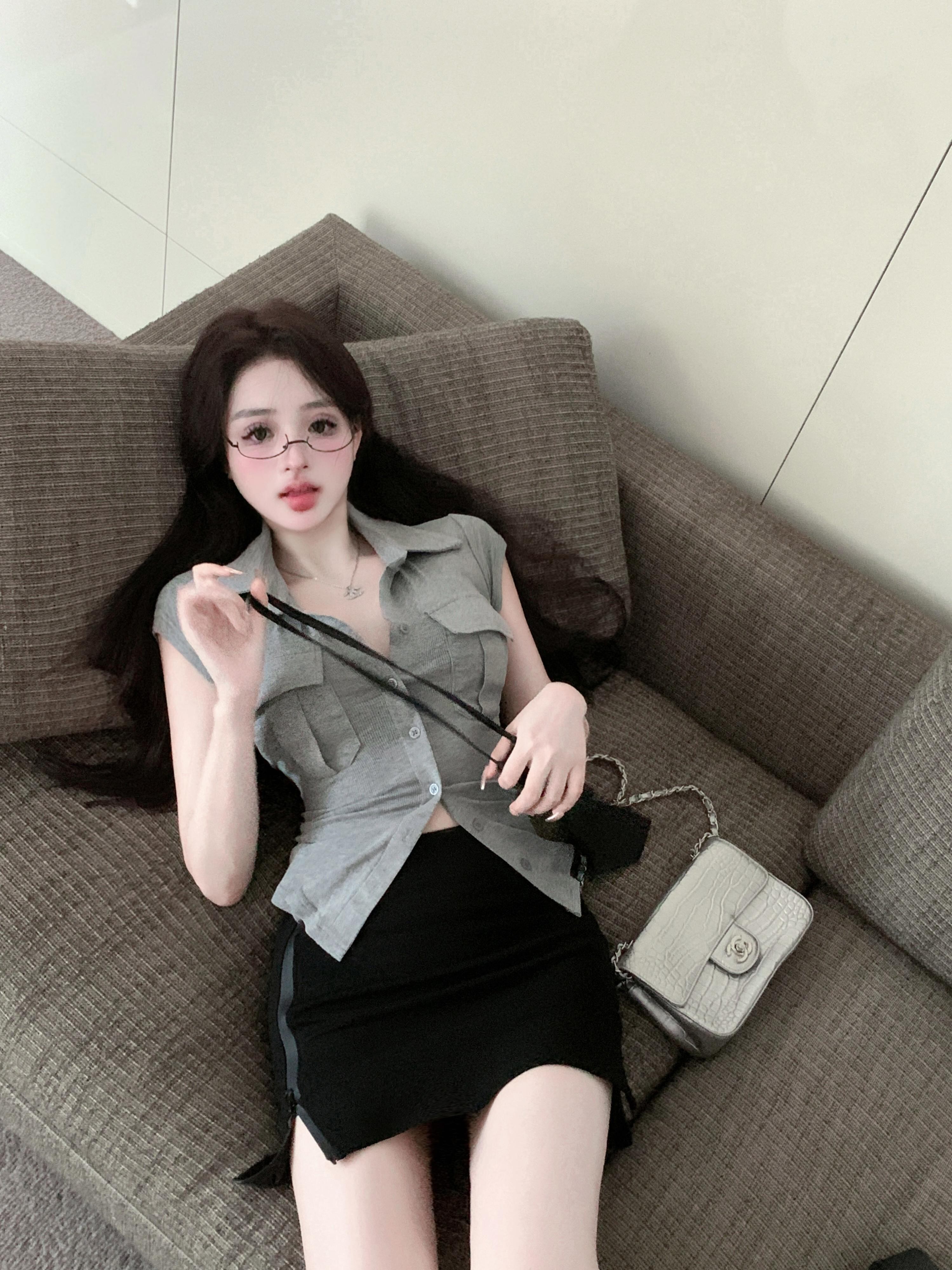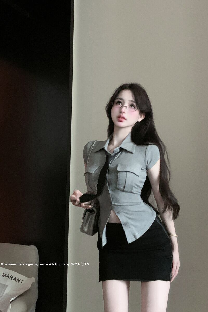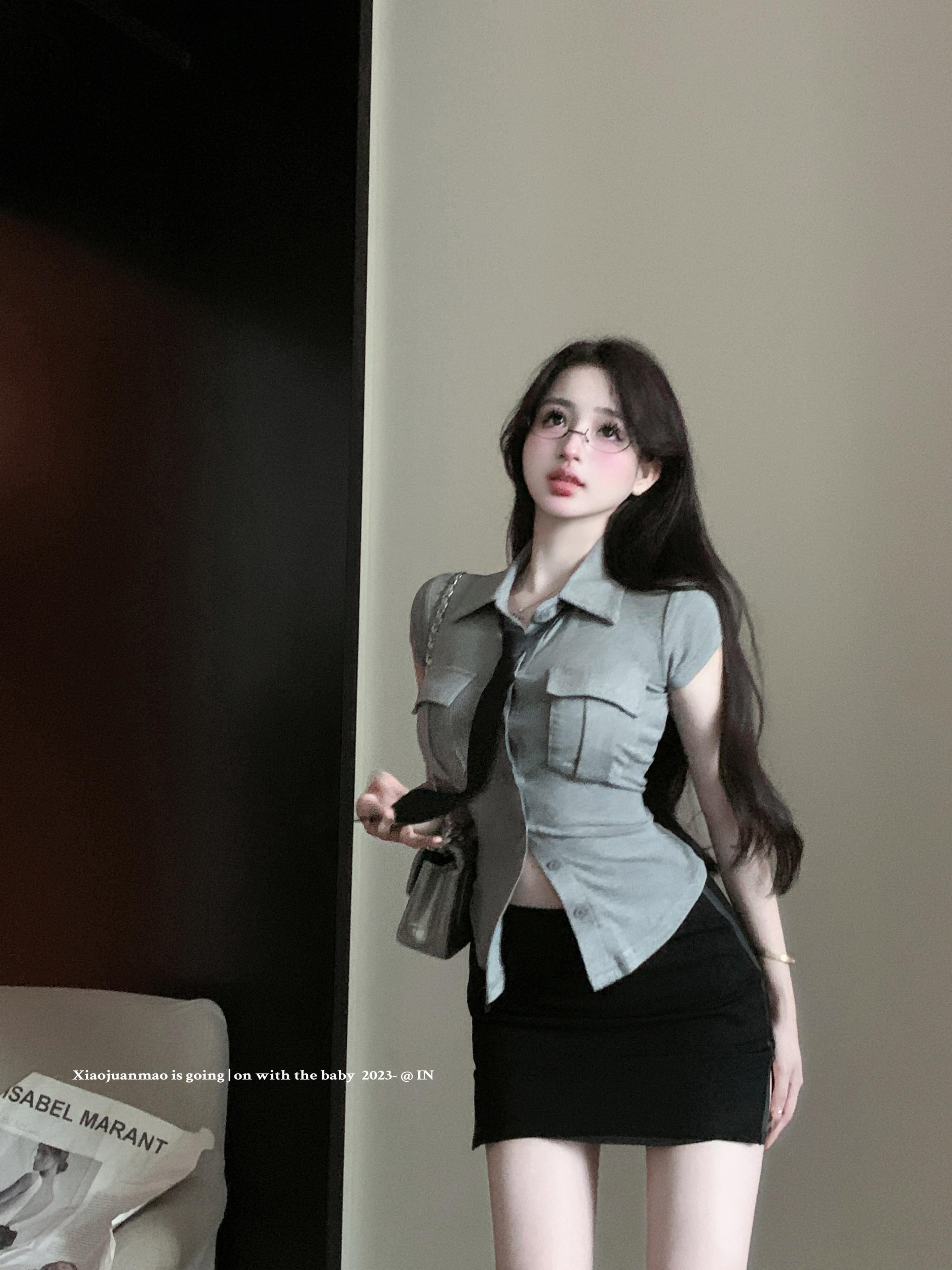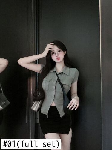 アメリカンスウィートホットガールスーツ夏半袖スリムフィットシャツトップ黒ラップヒップミニスカート2点セット ブラック 大人ガーリー キュート カジュアル サマー 夏物