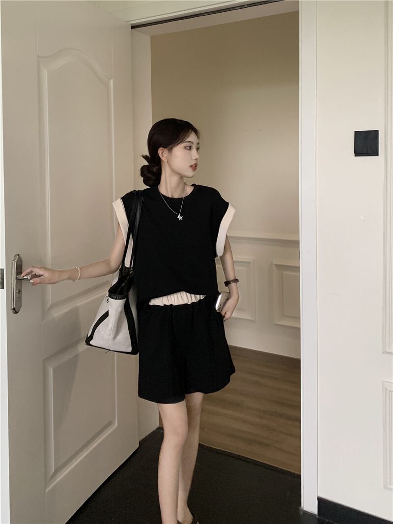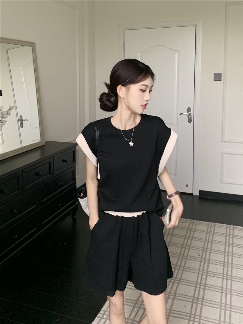 ホットガールスポーツスーツ夏コントラストノースリーブ Tシャツウエストショーツ 2 点セット服 サマー 夏物 ブルマー