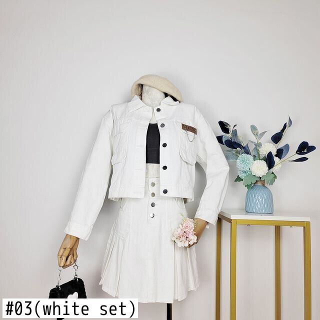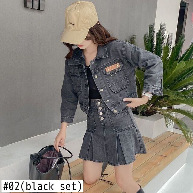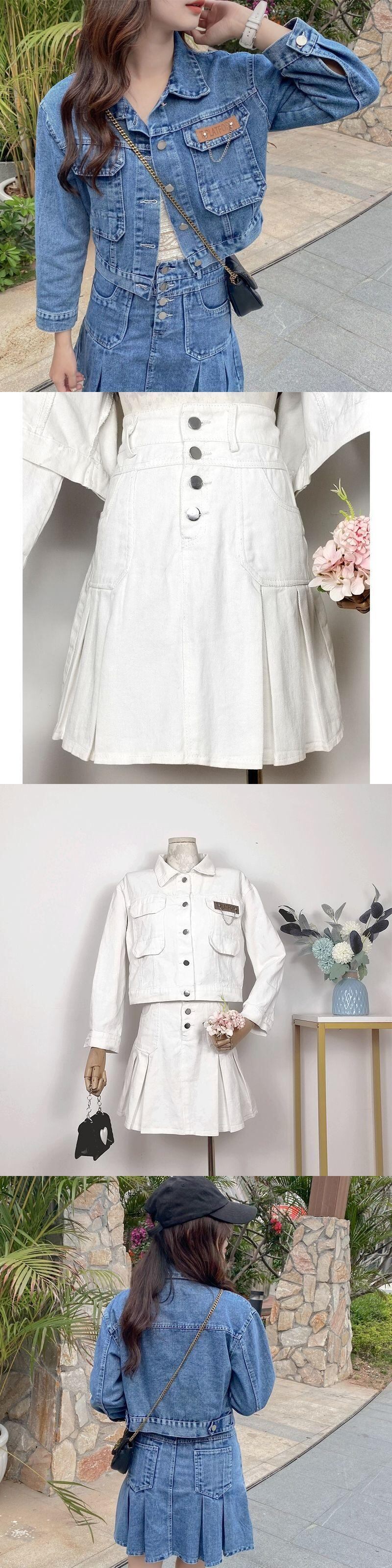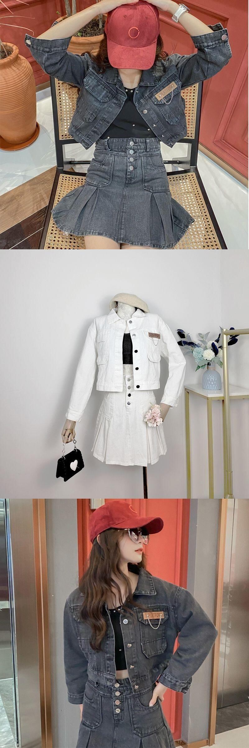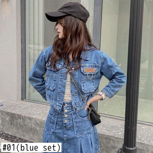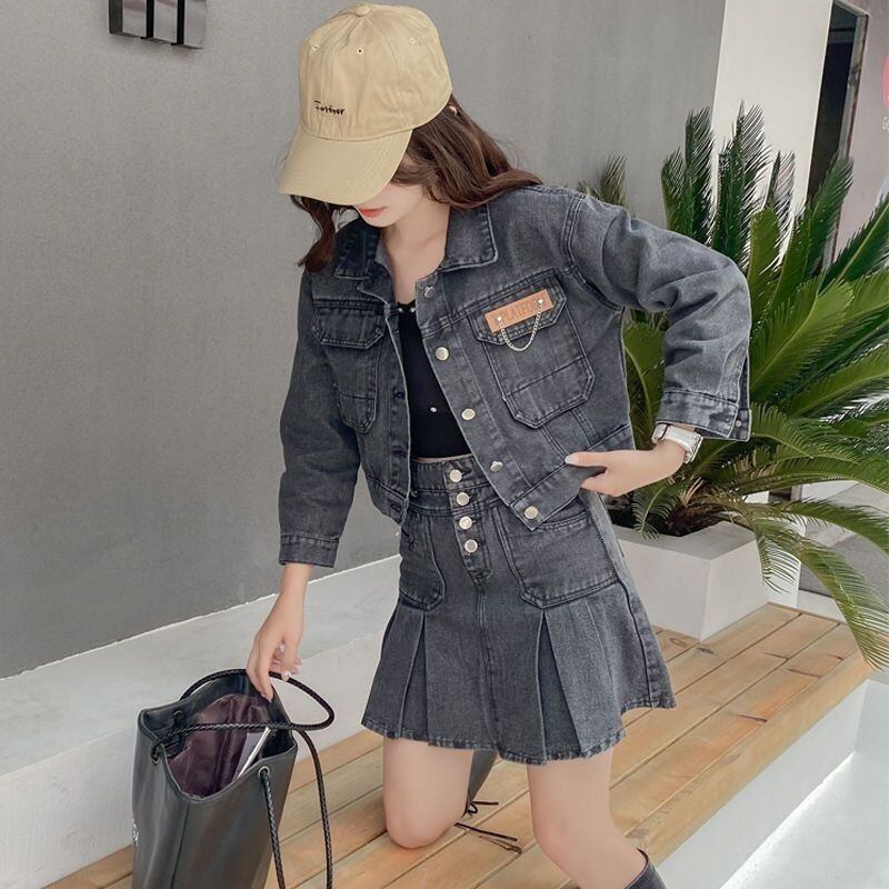 スタイルスーツ春/秋デニムショートコートウエストプリーツスカートツーピースセット服 スプリング 春物 オータム 秋物