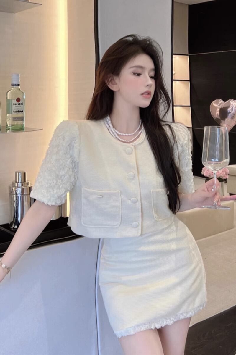 フレンチスタイルスウィートガールスーツ夏Oネック半袖トップウエストミニスカートツーピースセット服 大人ガーリー キュート カジュアル サマー 夏物