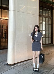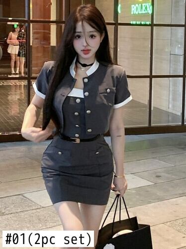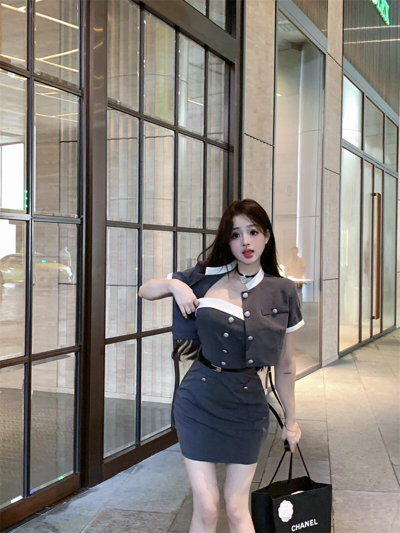 スイートガールスーツ夏ストライプコントラスト半袖コートスリムフィットストラップレスドレスツーピースセット服 大人ガーリー スウィート キュート カジュアル サマー 夏物