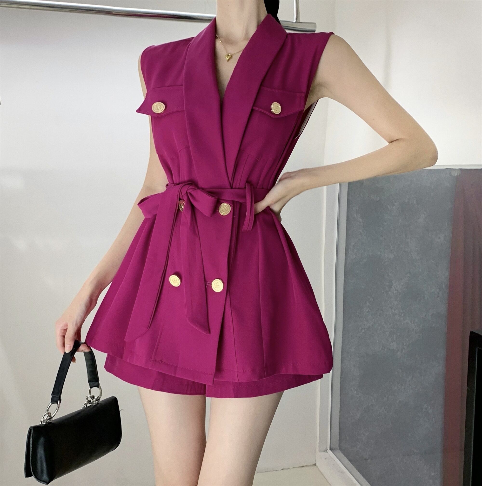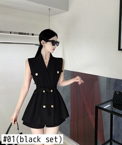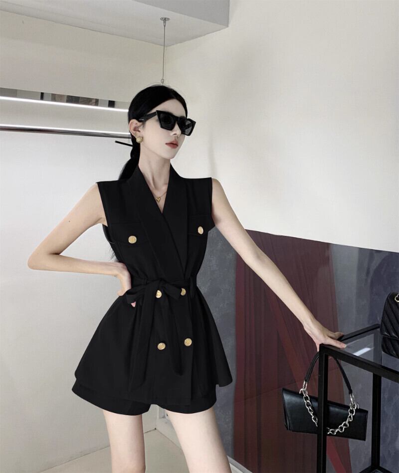 オフィスレディ通勤スーツ夏レースアップベストミドル丈トップ弾性ウエストワイドレッグショーツ 2 点セット服 エラスティック 伸縮 サマー 夏物 ブルマー ワイドパンツ 会社 学校 通勤や通学にも