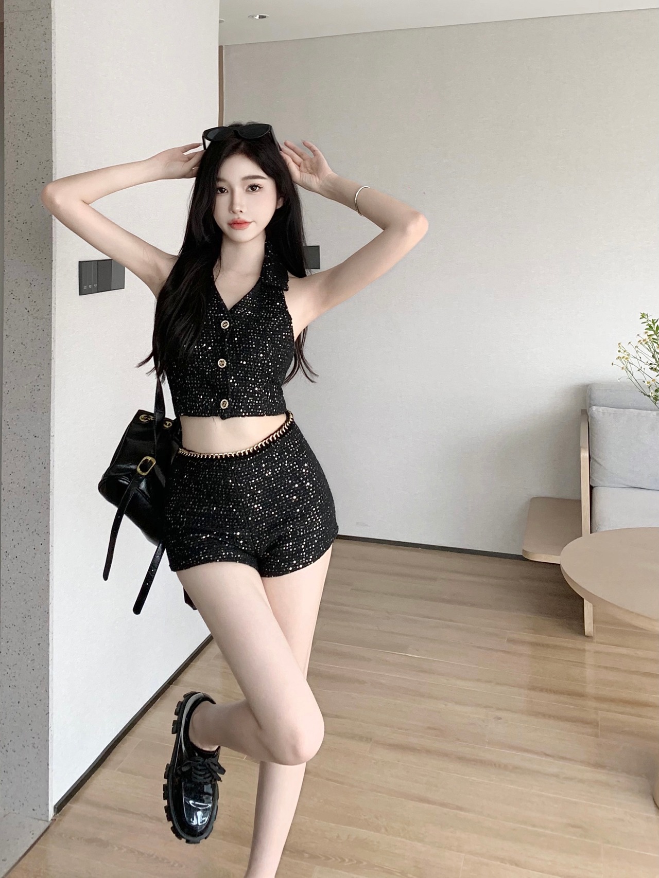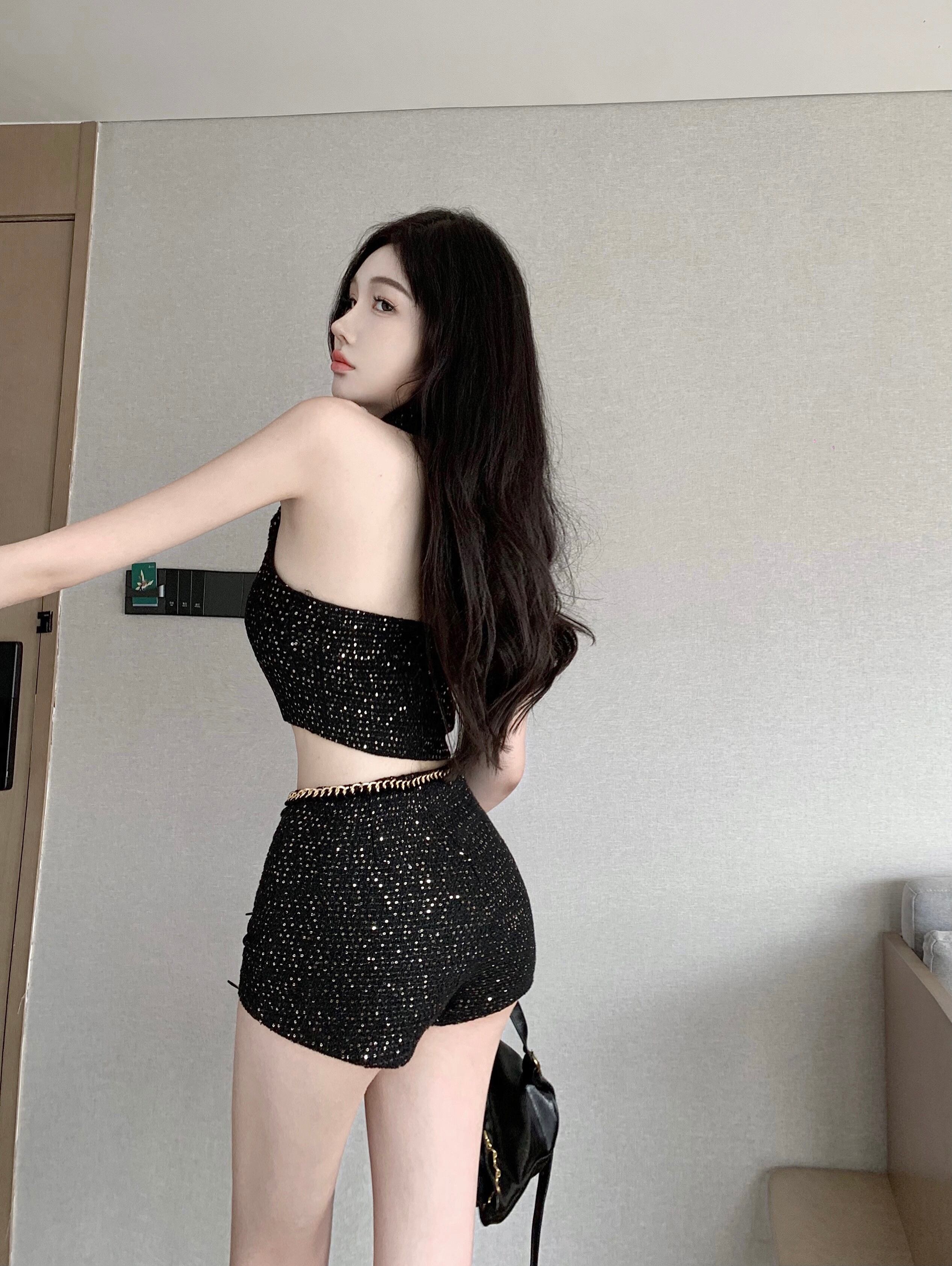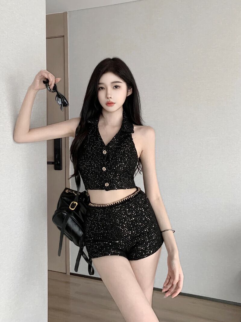甘いホットガールズスーツ夏スパンコールホルター V ネックタンクトップウエストチェーンショーツ 2 点セット服 大人ガーリー スウィート キュート カジュアル サマー 夏物 ブルマー Vネック