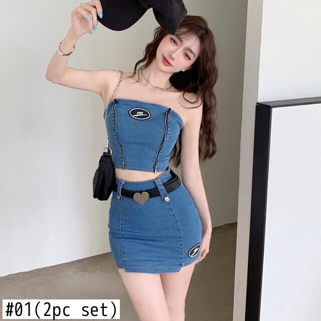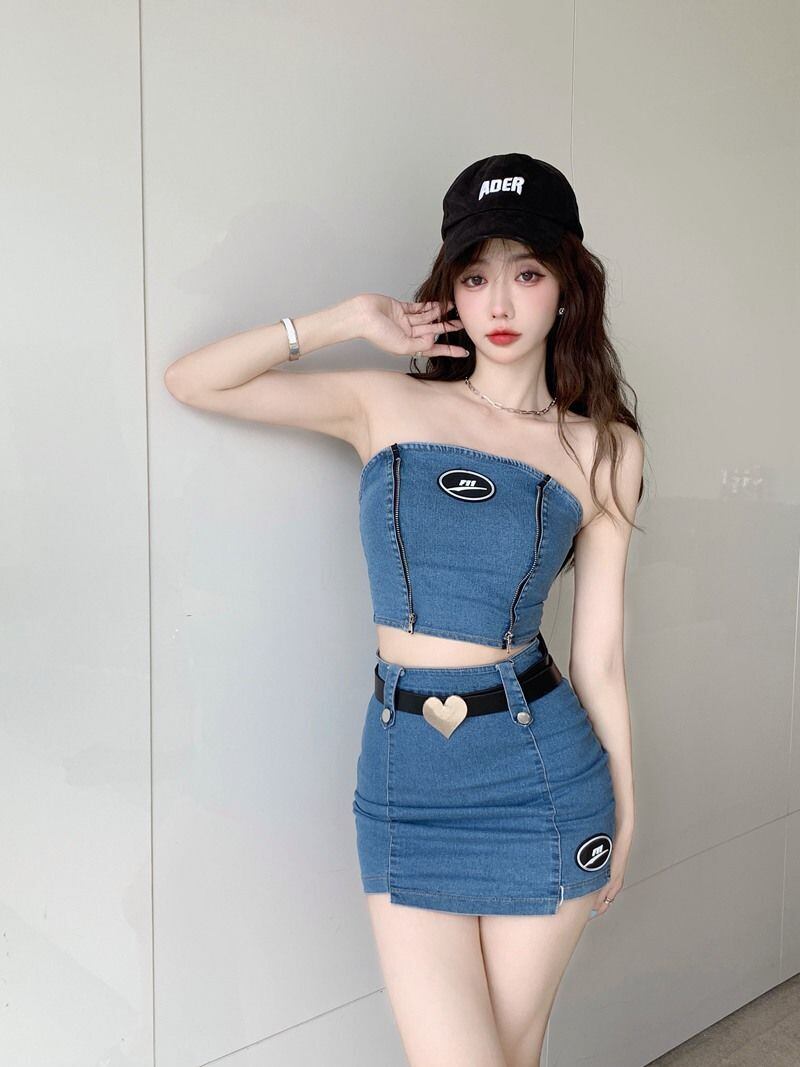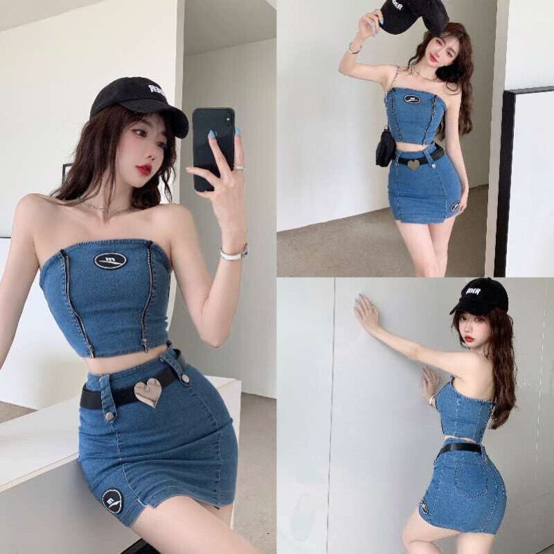 甘いホットガールセクシースーツ夏デニムストラップレススリムフィットトップウエストミニスカートツーピースセット服 大人ガーリー スウィート キュート カジュアル サマー 夏物