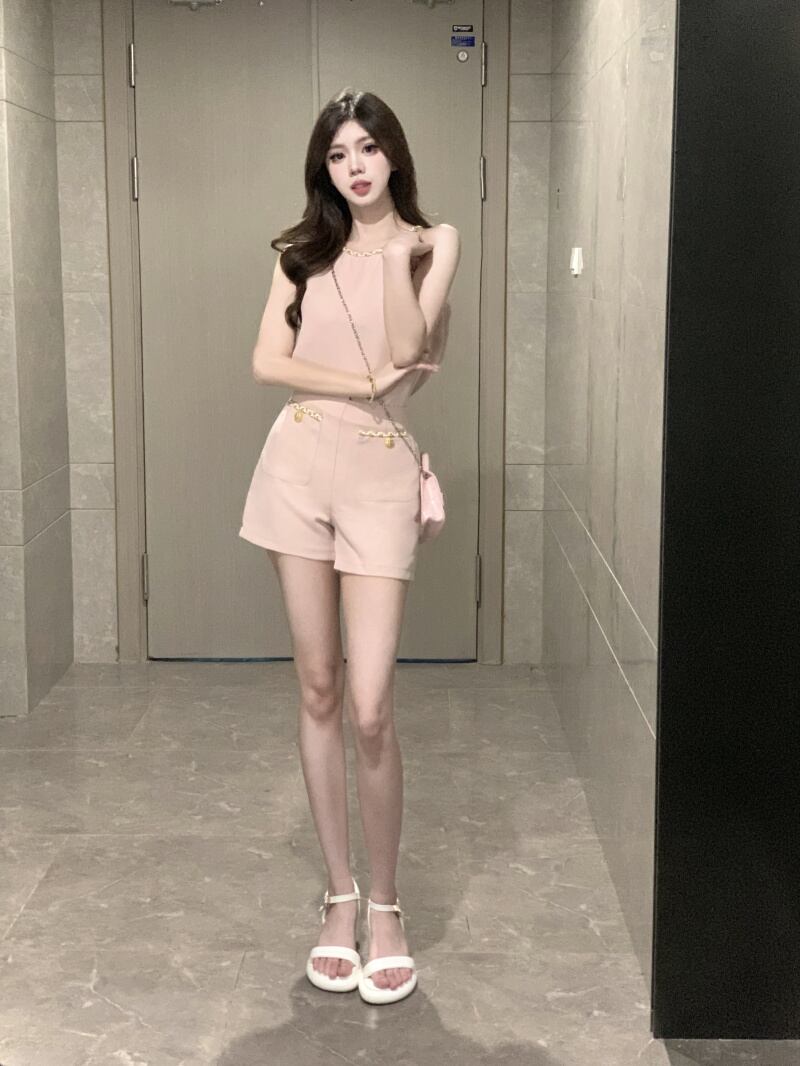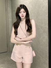 甘いスーツ夏ノースリーブラウンドネックベストトップハイウエストショーツ 2 点セットファッション服 ハイウェスト 大人ガーリー スウィート キュート カジュアル サマー 夏物 ブルマー Oネック