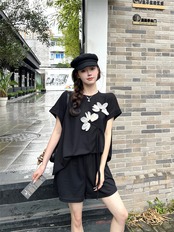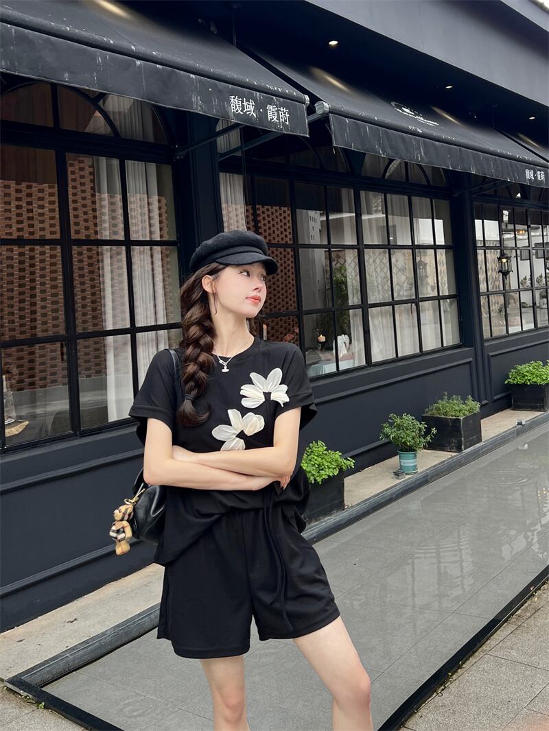 甘いホットガール黒スーツ夏花 O ネック Tシャツワイドレッグショーツ 2 点セット服 ブラック 大人ガーリー スウィート キュート カジュアル サマー 夏物 ブルマー Oネック ワイドパンツ フラワーデザイン