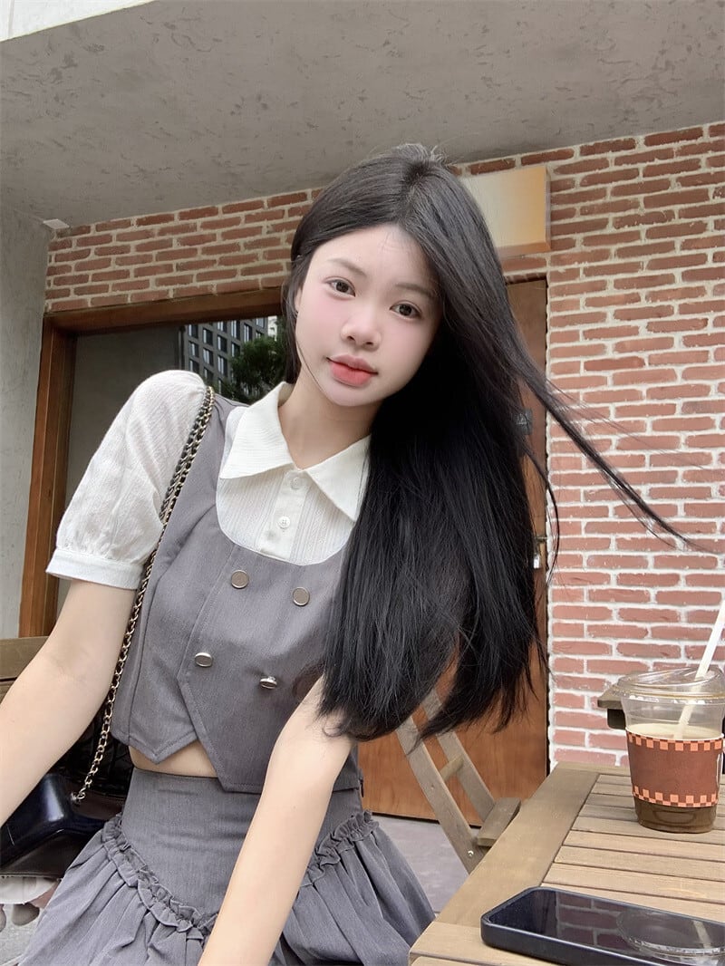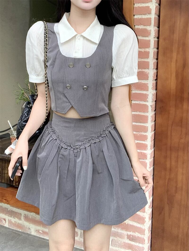 ホットガールプレッピースタイルスーツ夏スプライススリムフィットバブルスリーブシャツウエスト A ラインスカート 2 点セット サマー 夏物 Aライン