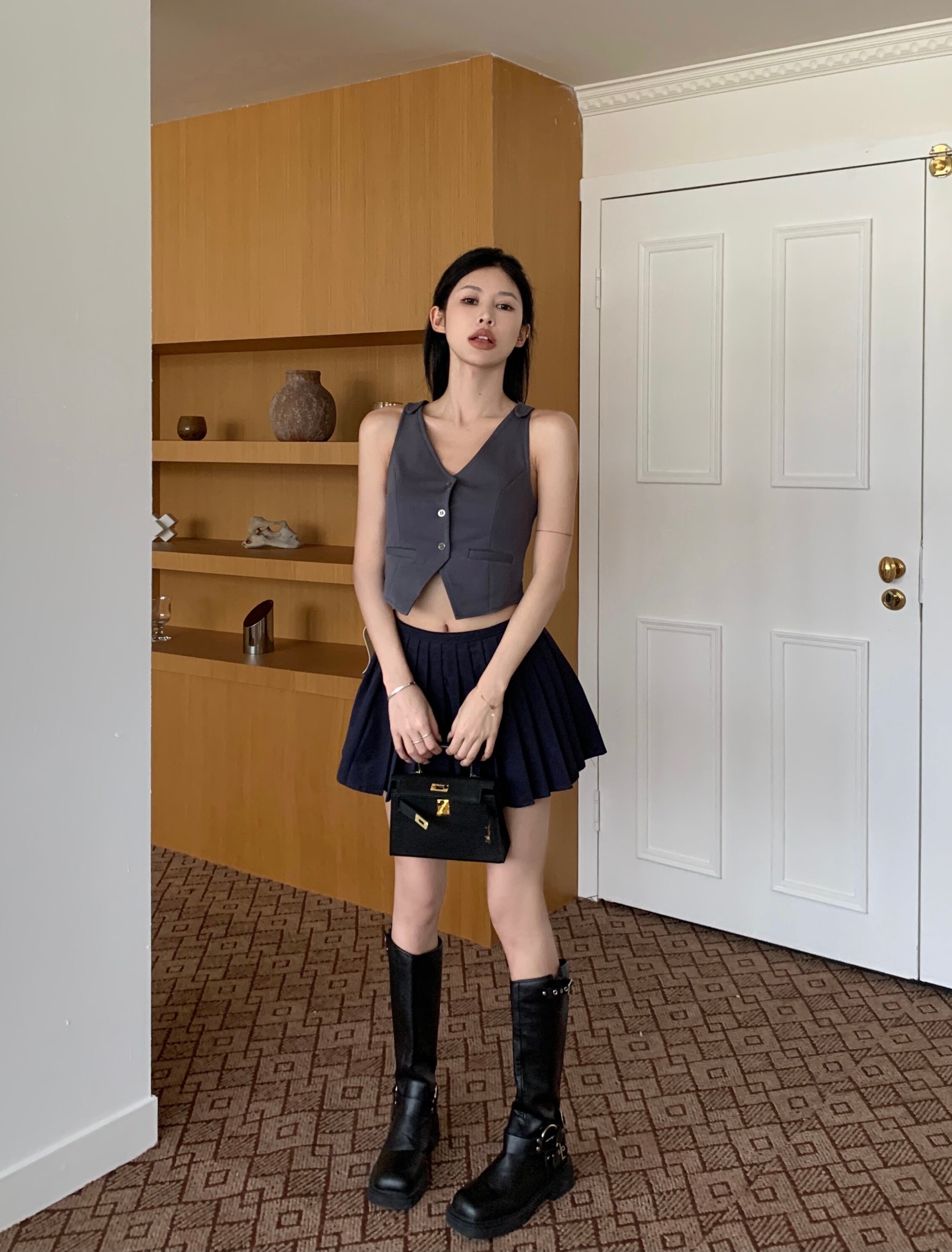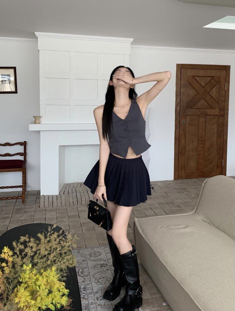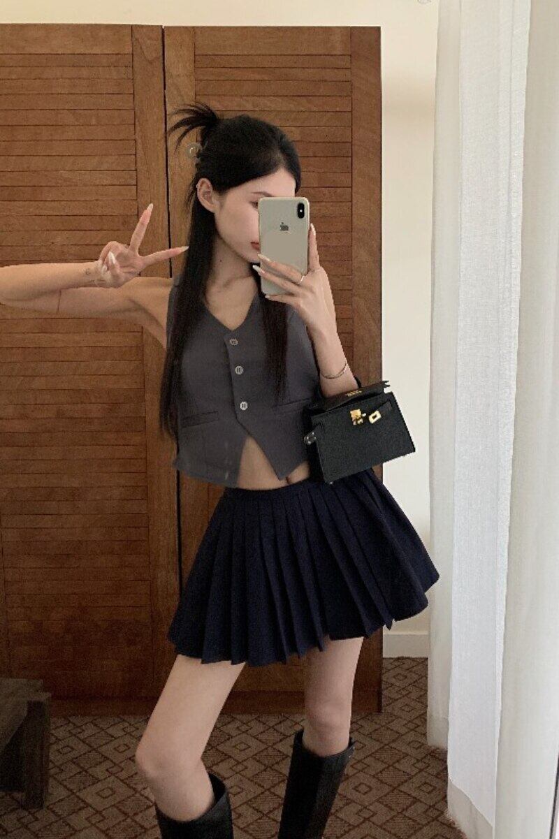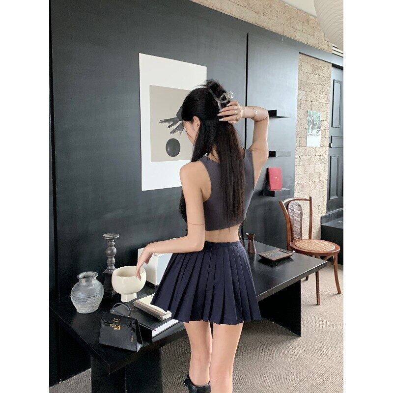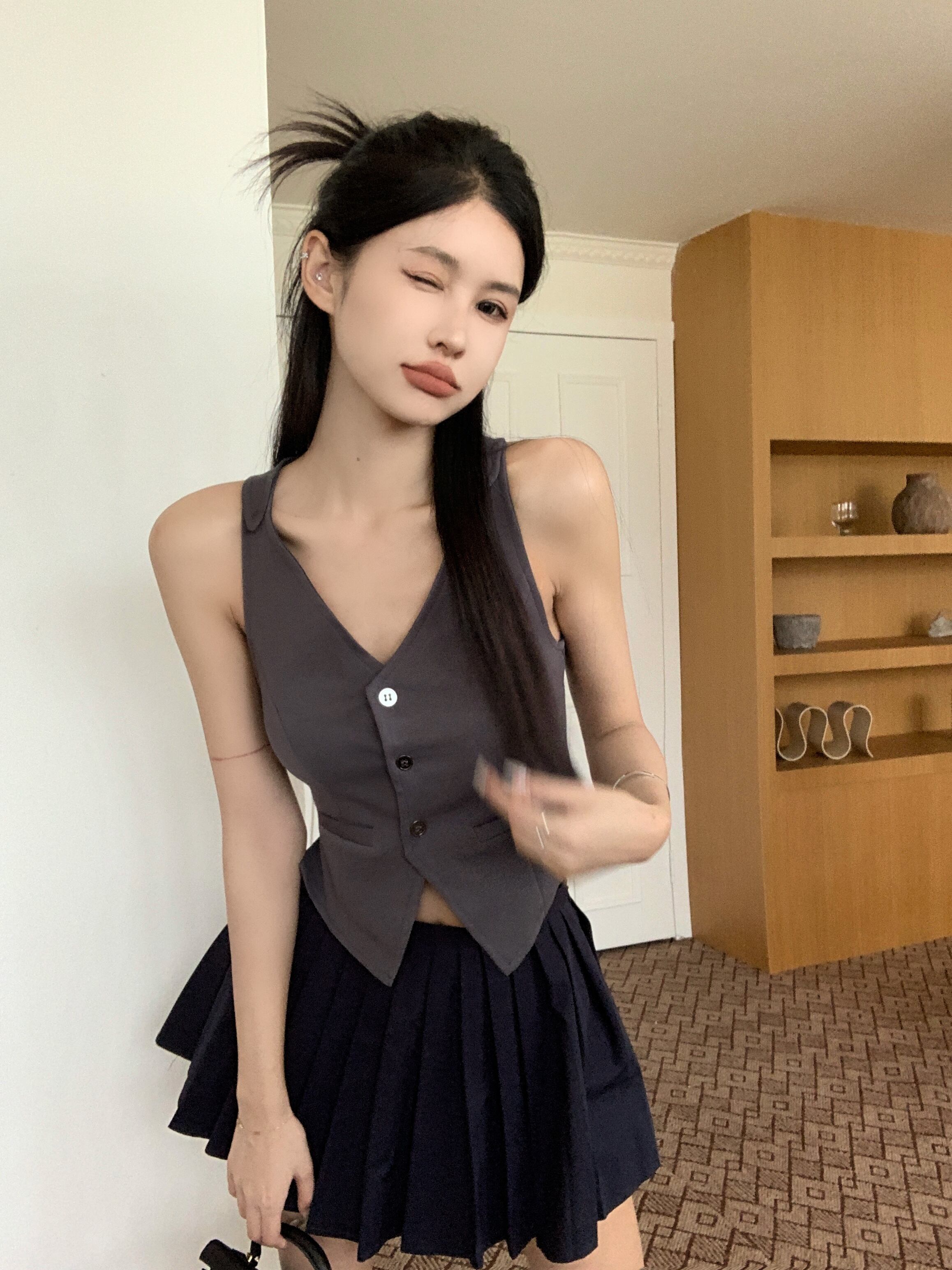 アメリカンレトロホットガールズスーツ夏セクシースリムフィット V ネックベストウエストプリーツショートスカート 2 点セット サマー 夏物 Vネック