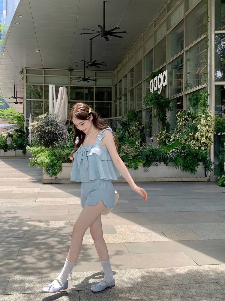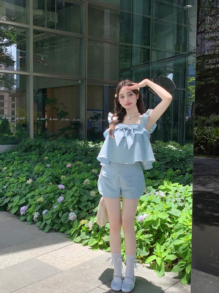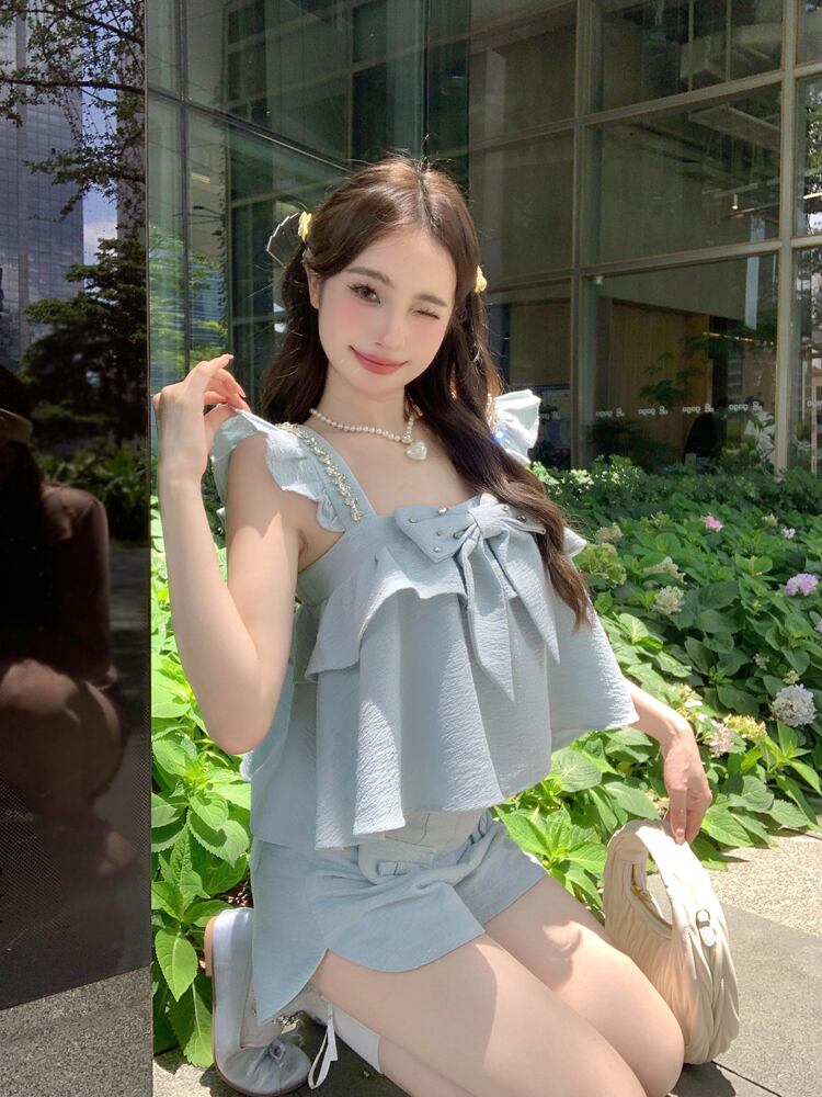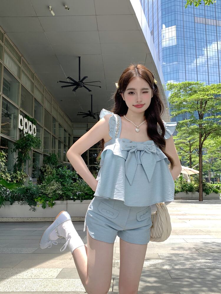 甘いホットガールスーツ夏フリルスクエアカラーストラップダイヤモンドボウトップウエストショーツ 2 点セット服 リボン 大人ガーリー スウィート キュート カジュアル サマー 夏物 ブルマー スクウェア