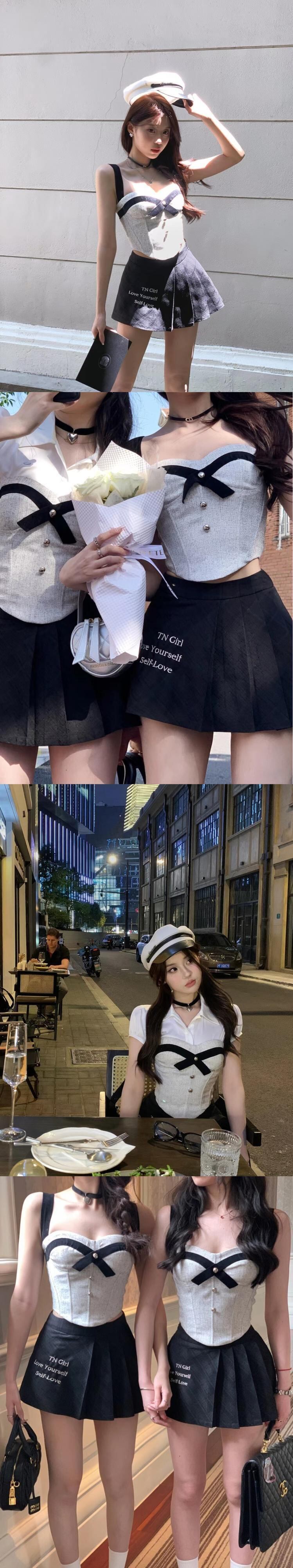 アメリカンプレッピースタイルホットガールスーツ夏魚骨ストラップトッププリーツショートスカートツーピースセット服 サマー 夏物