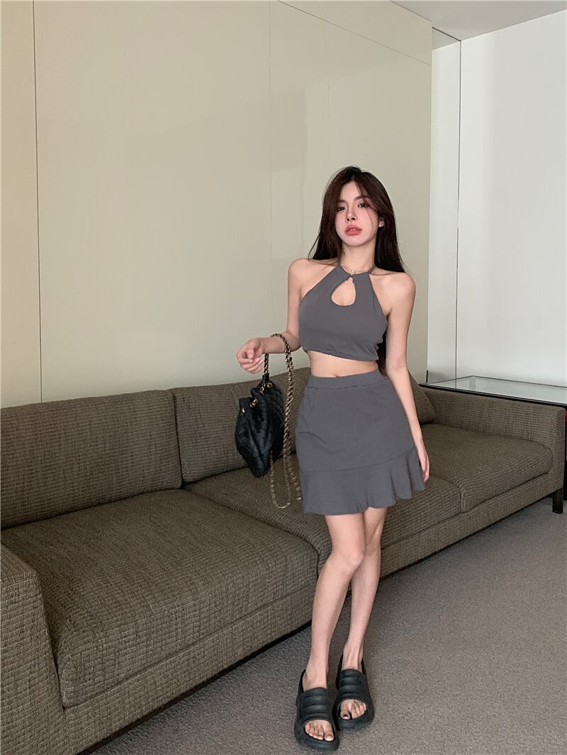 スイートホットガールスーツ夏 V ネックノースリーブ背中開いたホルターネックベストフリル尻ラップミニスカート 2 点セット 大人ガーリー スウィート キュート カジュアル サマー 夏物 Vネック