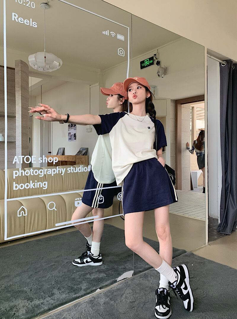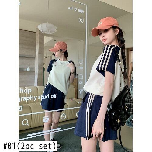 ホットガールスーツ夏ストライプカラー半袖 Tシャツ夏ウエストミニスカート 2 点セット服 レッド サマー 夏物