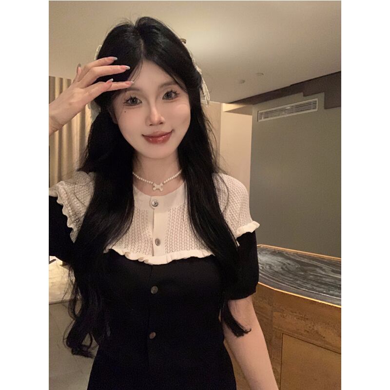 甘いホットガール黒ニットスーツ夏ラウンドネックスプライシングシングルブレストトップウエストミニスカート 2 点セット ブラック 大人ガーリー スウィート キュート カジュアル サマー 夏物 Oネック