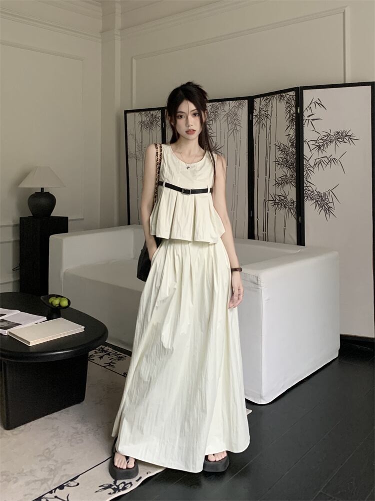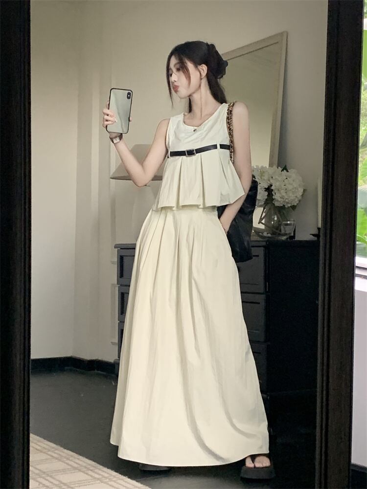 甘いホットガールスーツ夏ノースリーブ O ネックタンクトップウエスト A ラインロングスカート 2 点セット服 大人ガーリー スウィート キュート カジュアル サマー 夏物 Oネック Aライン