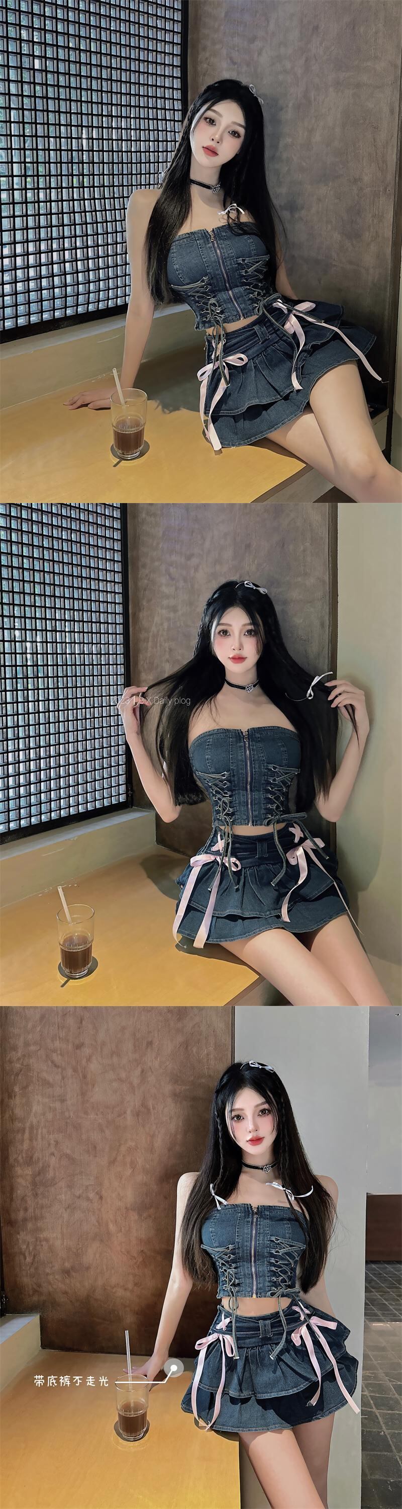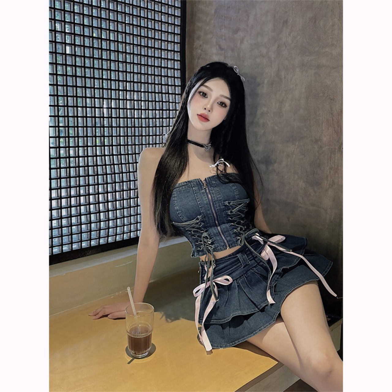 クールホットガールセクシースーツ夏オフショルダースリムフィットレースアップベストフリルショートスカートデニムツーピースセット服 サマー 夏物