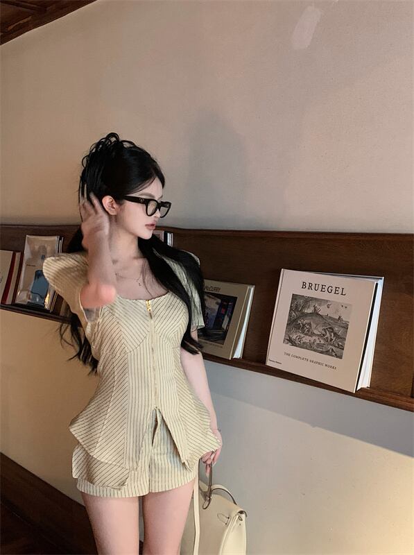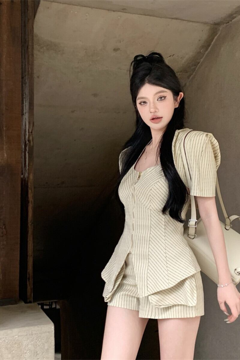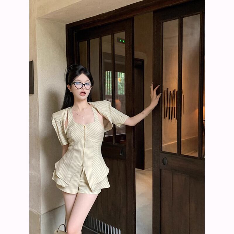 ホットガールスーツ夏ストライプホルターネックトップ半袖コートウエストショーツ 3 点セット服 サマー 夏物 ブルマー