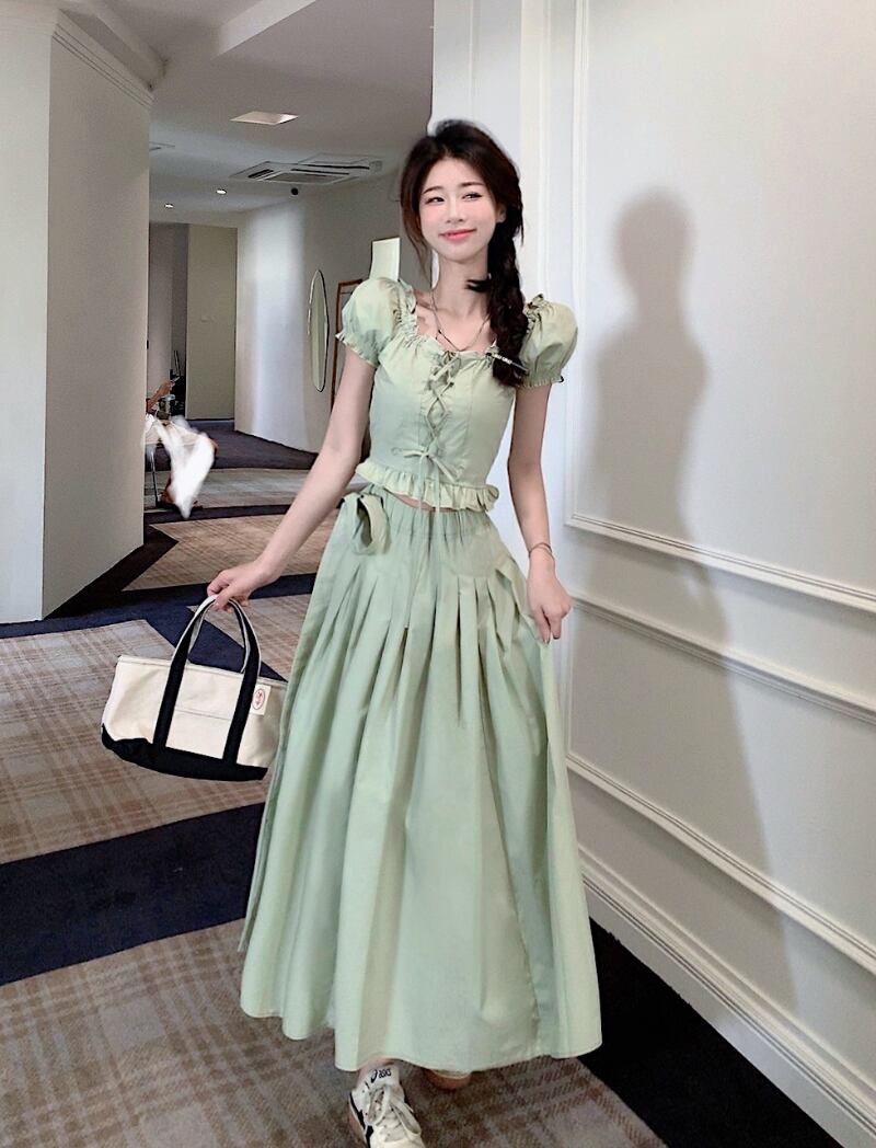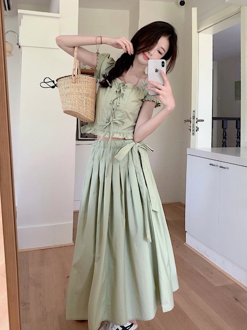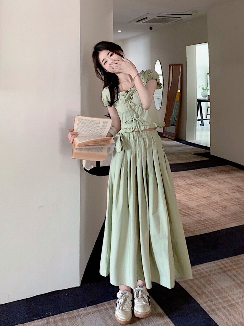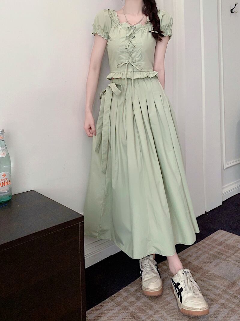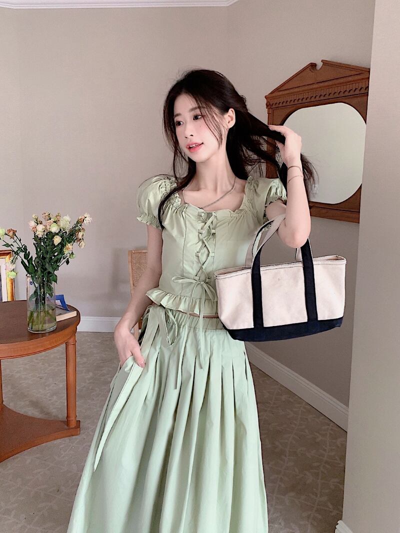 スイートガールスーツ レディース 夏 レースアップ スクエアカラー バブルスリーブ シャツ ウエスト ロング スカート 2点セット 服 大人ガーリー スウィート キュート カジュアル サマー 夏物 スクウェア