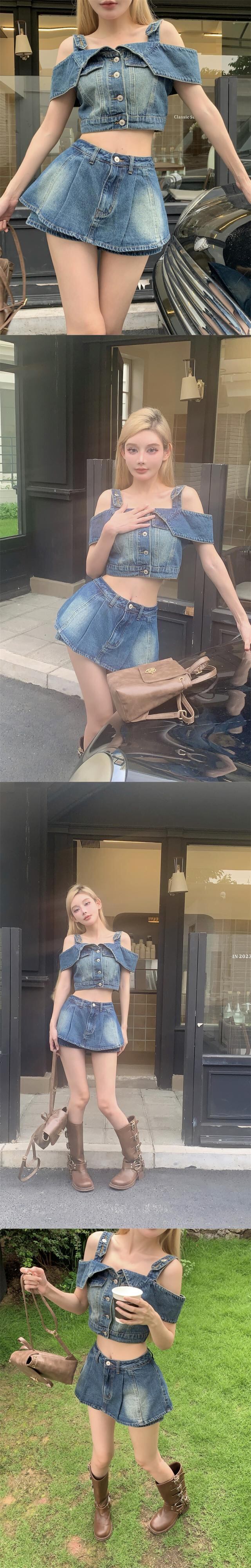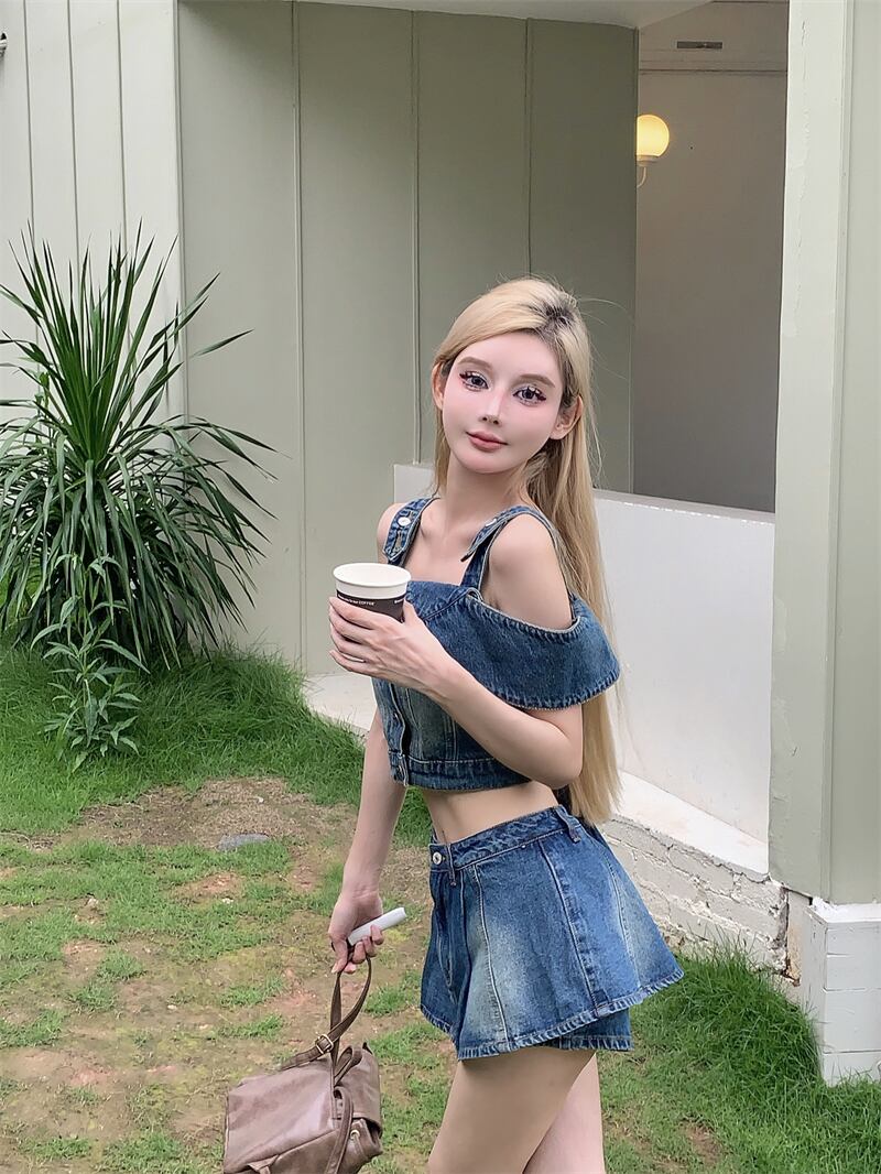 ホットガールセクシーデニムスーツ夏スラッシュネックストラップショートトップウエストミニスカートツーピースセット服 サマー 夏物