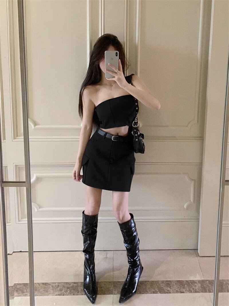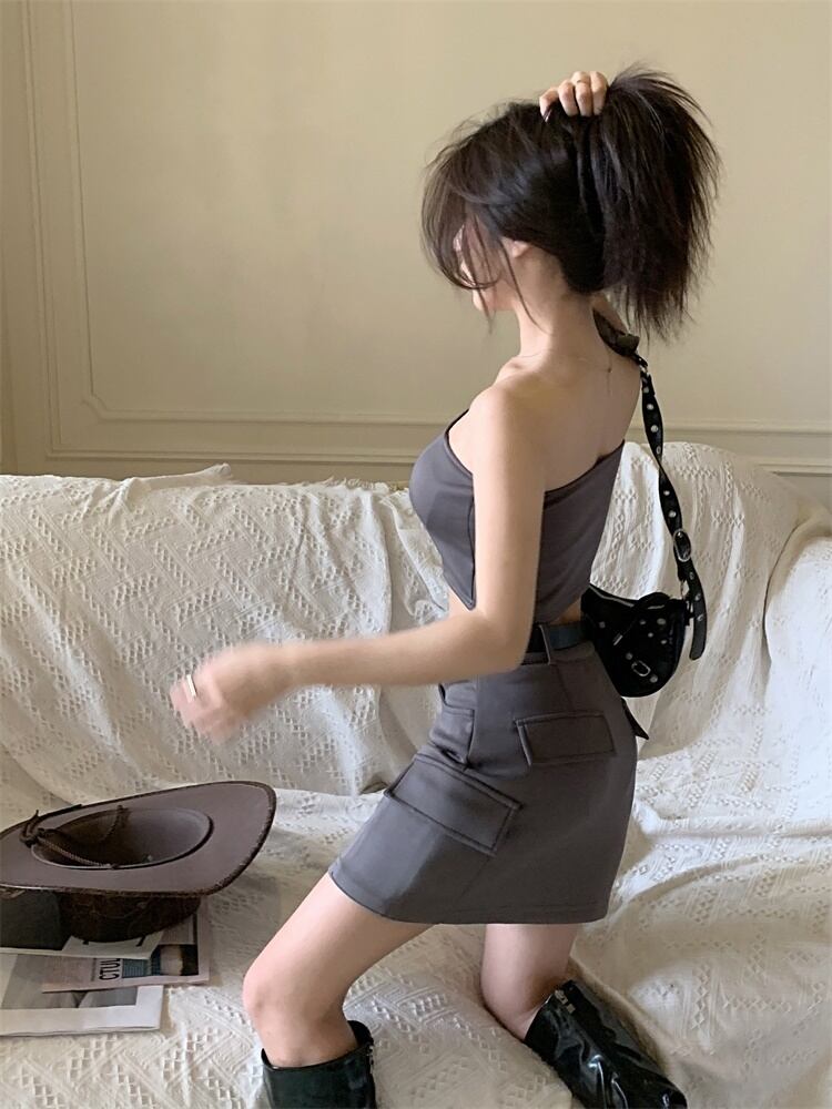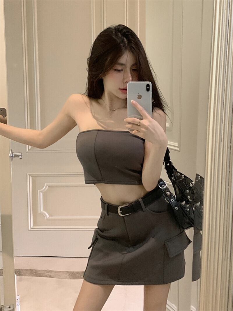 ホットガールスーツセクシーグレーストラップレスベストショートトップ夏グレードミニスカートツーピースセット服 サマー 夏物