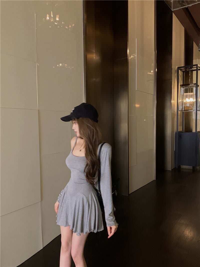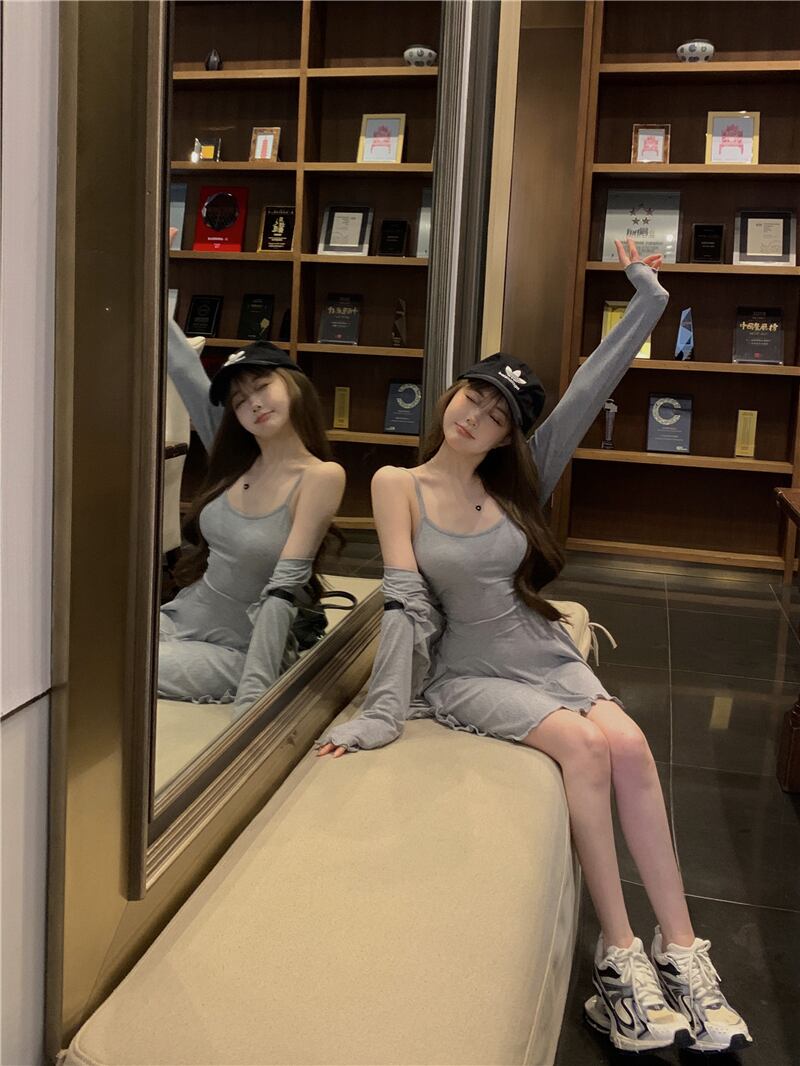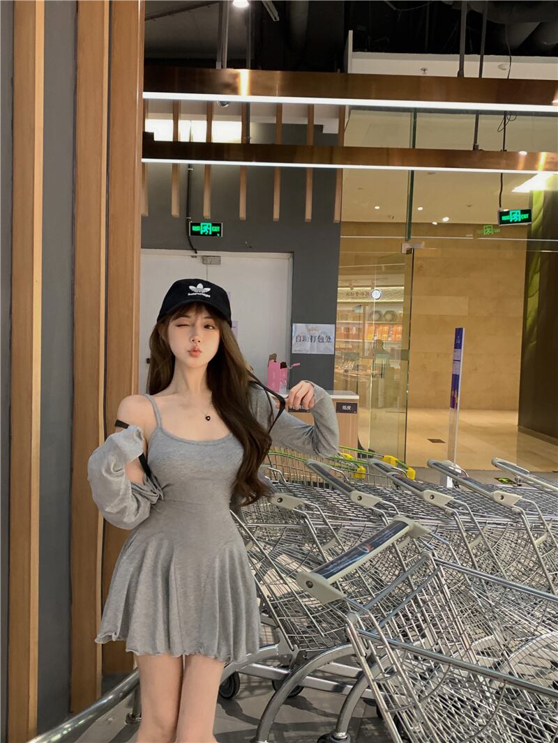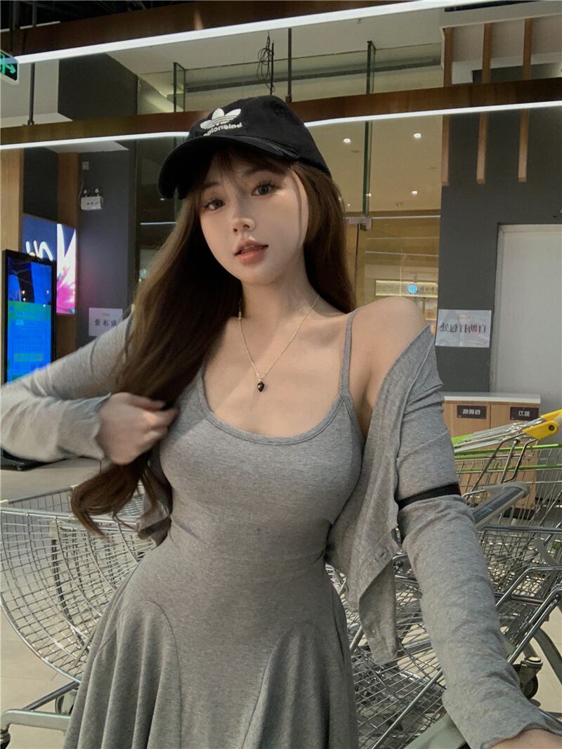 ホットガール純粋セクシースーツ夏スリムフィットドレスグレー長袖カーディガンツーピースセット服 ロング サマー 夏物 ピュア