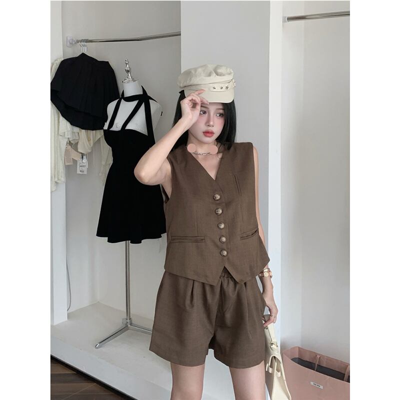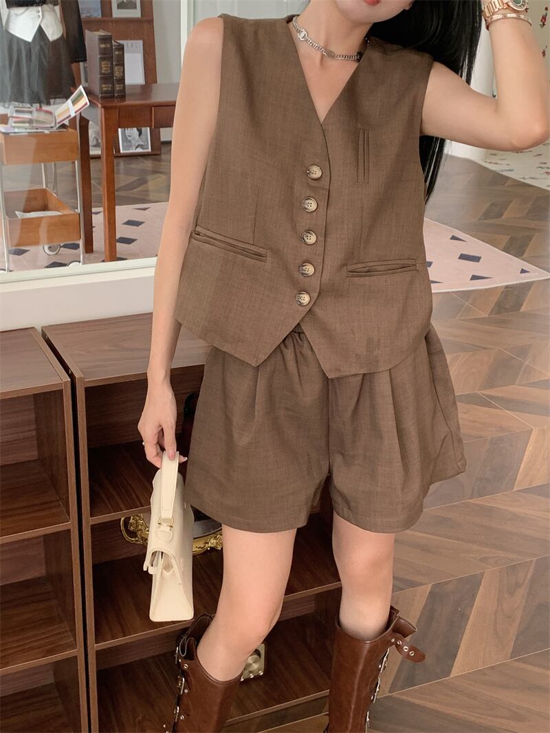 スタイルホットガールスーツ夏 V ネックベストコートウエストワイドレッグショーツ 2 点セット服 サマー 夏物 ブルマー Vネック ワイドパンツ