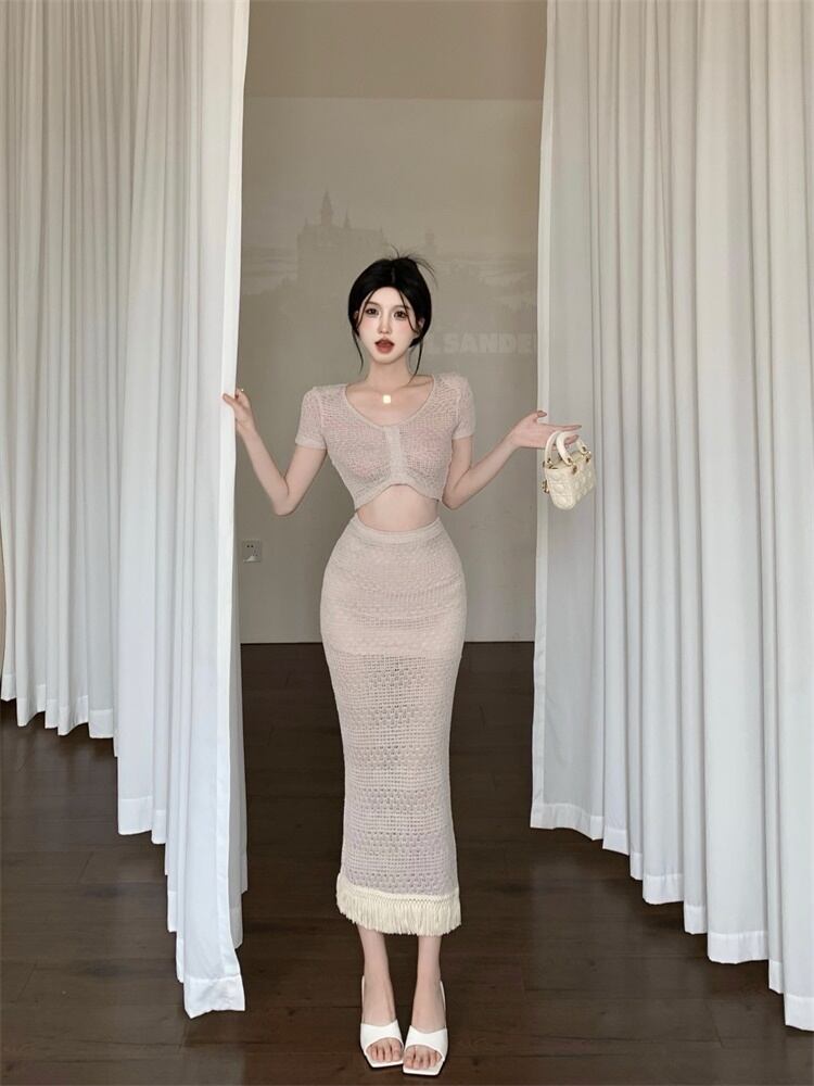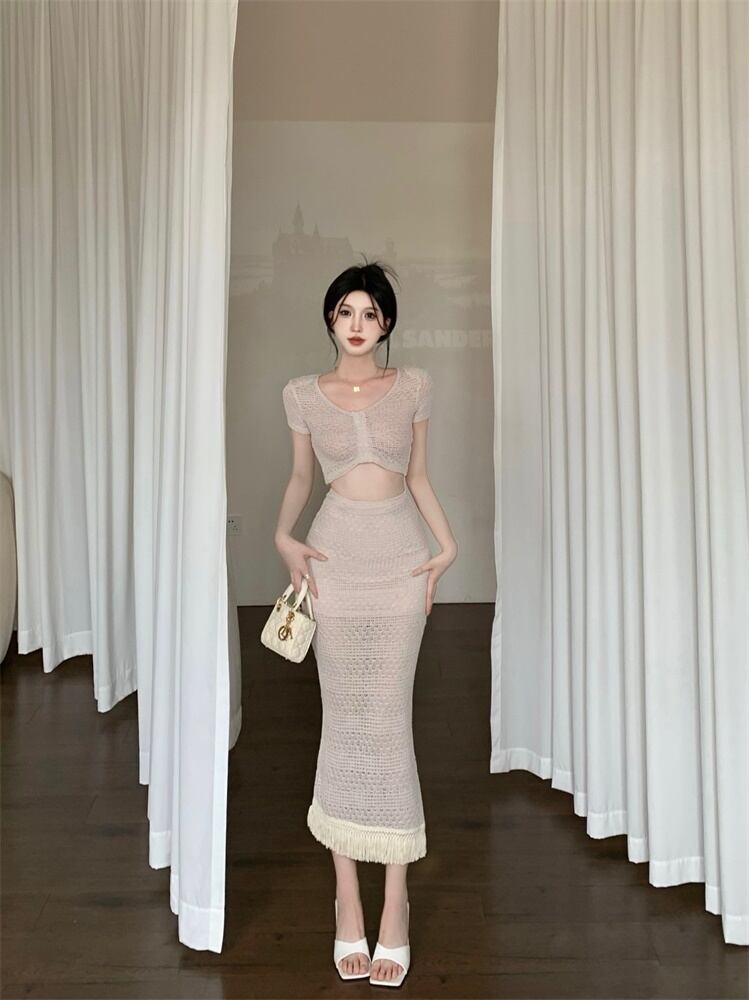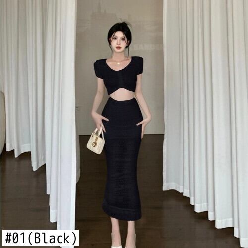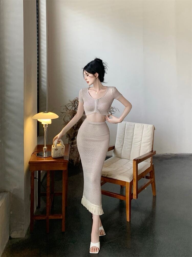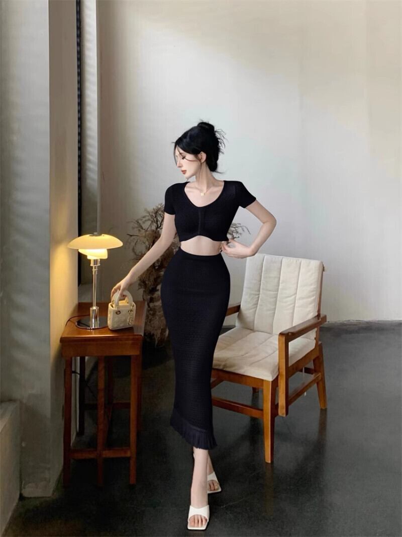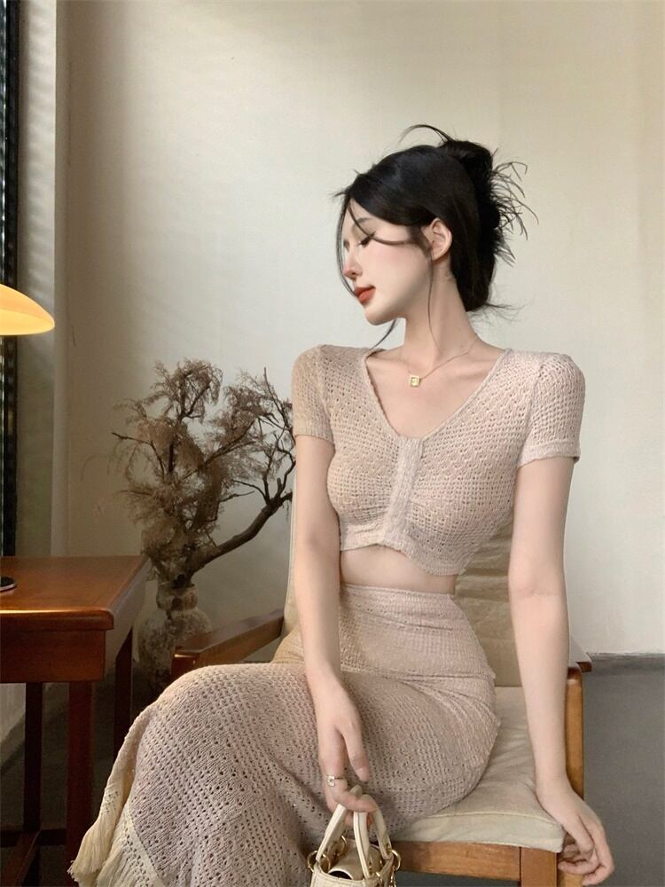 フレンチホットガールズセクシースーツ V ネックショートトップウエスト電話ロングスカートスリムフィット 2 点セット服 Vネック
