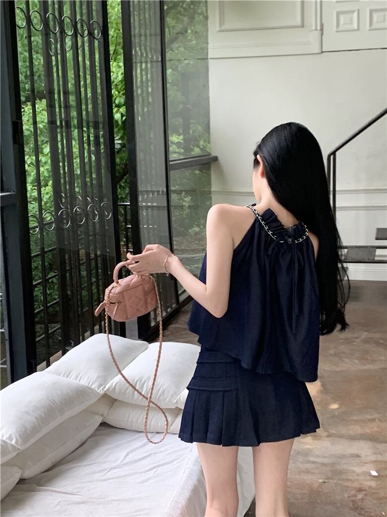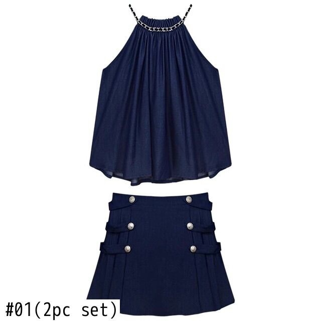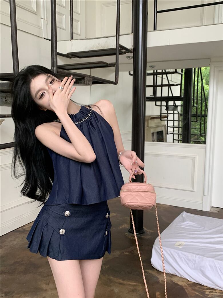 Sweet Girl スーツ レディース 夏 ホルターネック デニムシャツ トップ ウエスト プリーツ ミニスカート 2点セット 服 大人ガーリー スウィート キュート カジュアル サマー 夏物