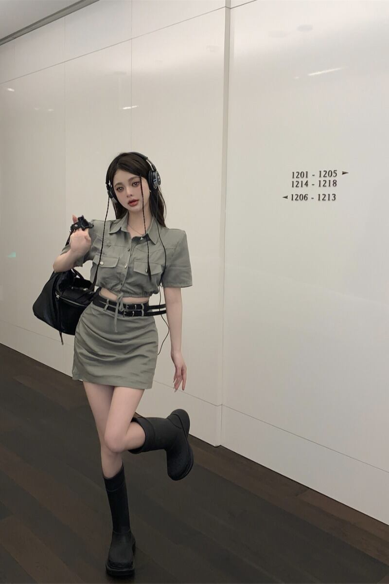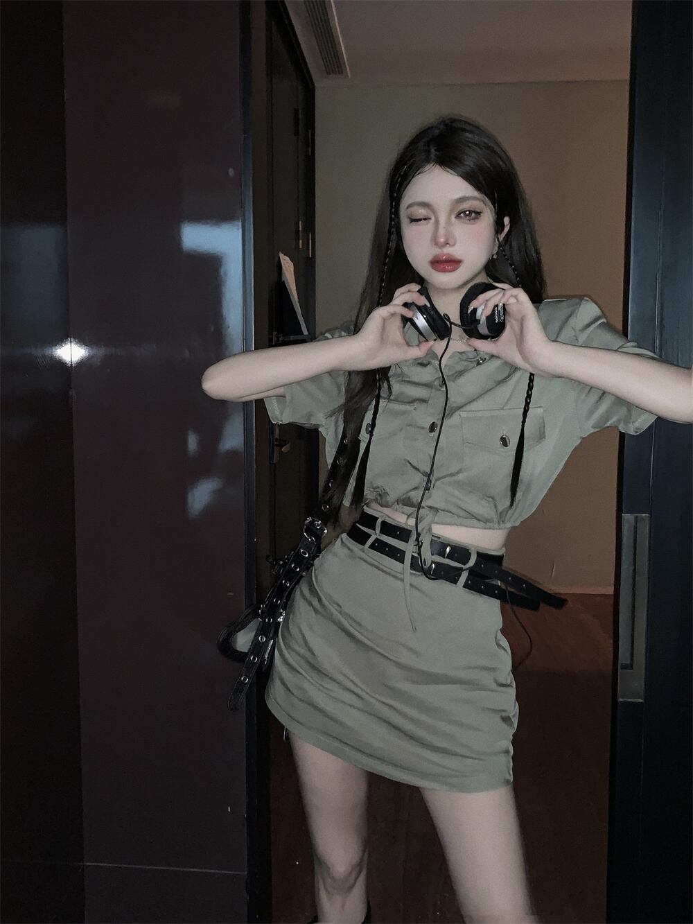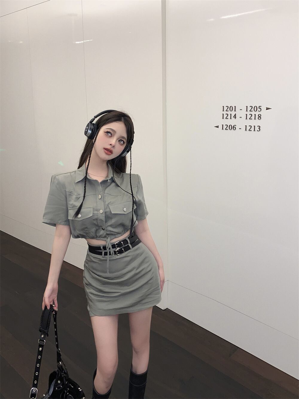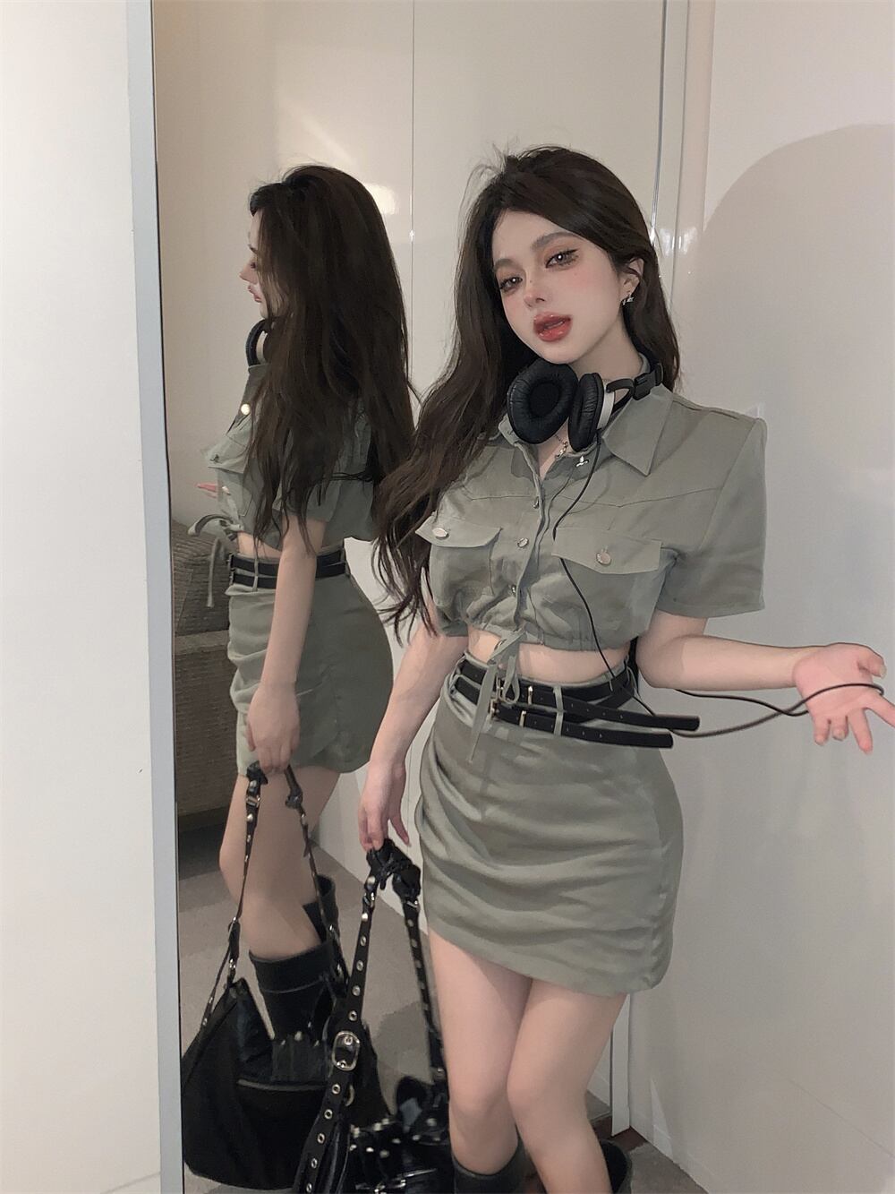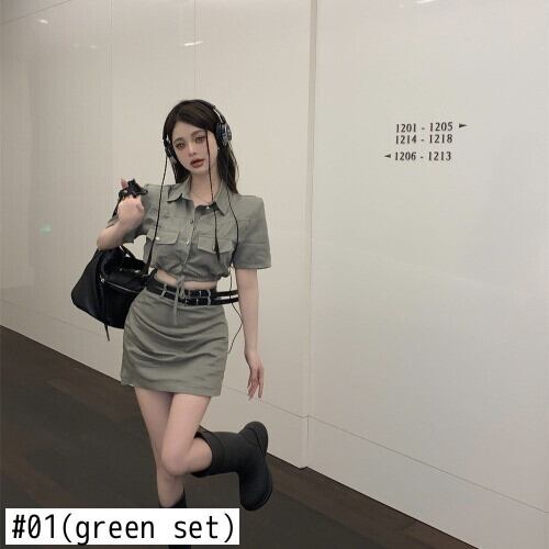 レトロスタイルホットガールスーツ夏ポロネック半袖トップウエストショートスカートツーピースセット服 サマー 夏物 Oネック