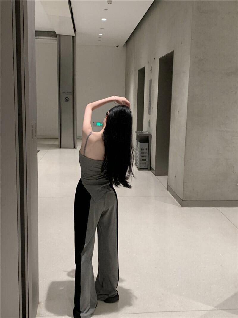 ホットガールスーツ夏純粋セクシースリムフィットスプリットストラップトップコントラストウエストワイドレッグパンツツーピースセット服 サマー 夏物 ワイドパンツ ピュア