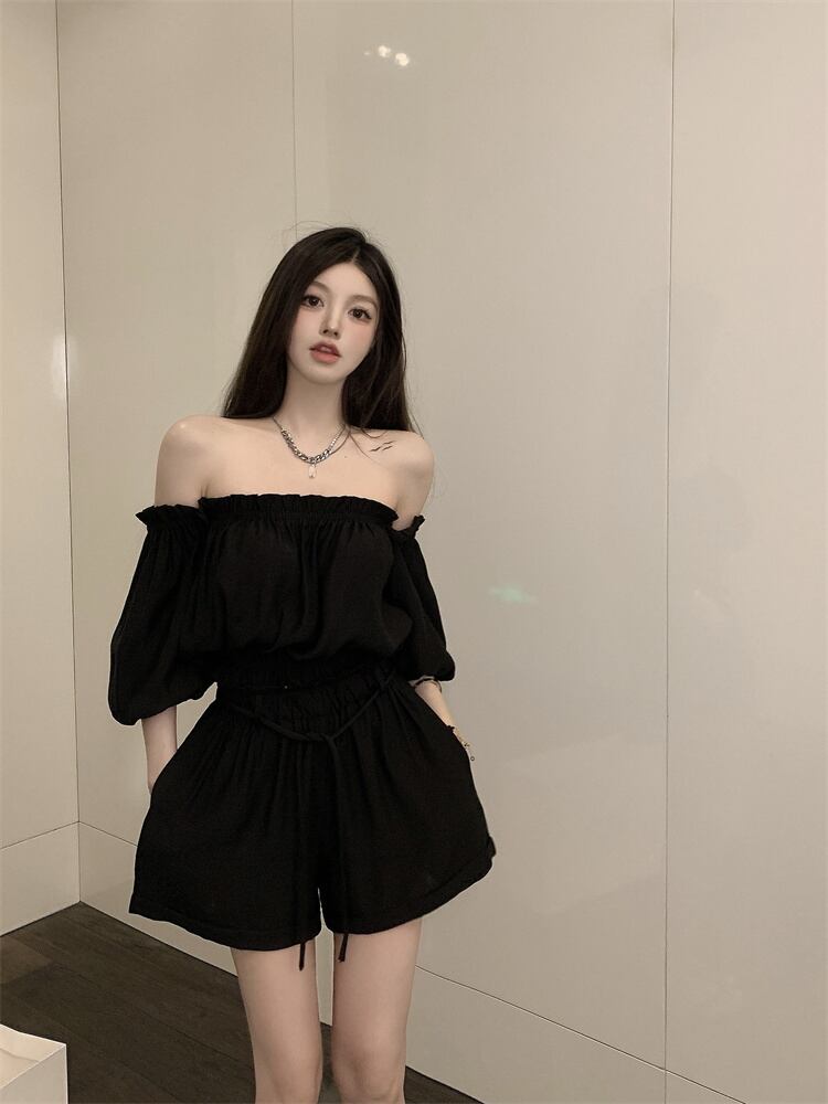 フレンチスタイル甘いホットガールスーツ夏オフショルダートップウエストルーズショーツツーピースセット服 大人ガーリー スウィート キュート カジュアル サマー 夏物 ブルマー