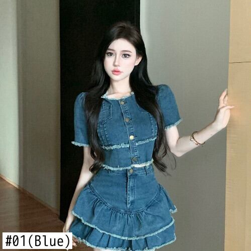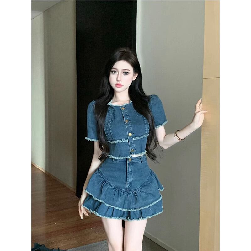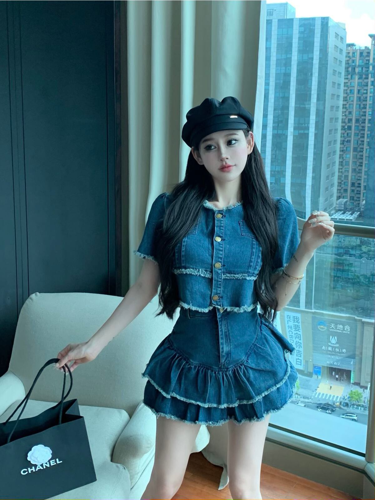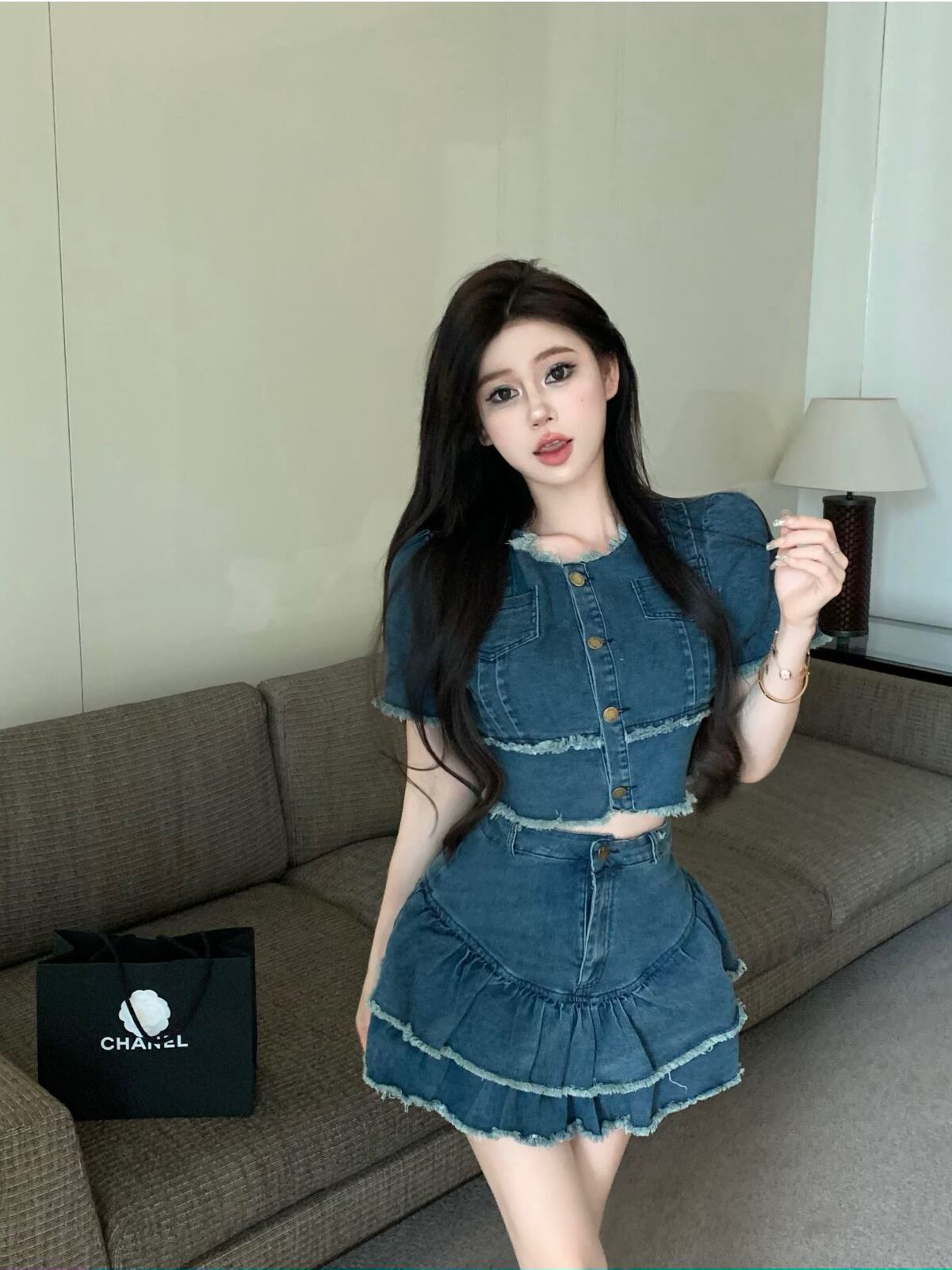甘いホットガールスーツ夏デニム O ネック半袖シャツトップウエストデニムスカート 2 点セット服 大人ガーリー スウィート キュート カジュアル サマー 夏物 Oネック