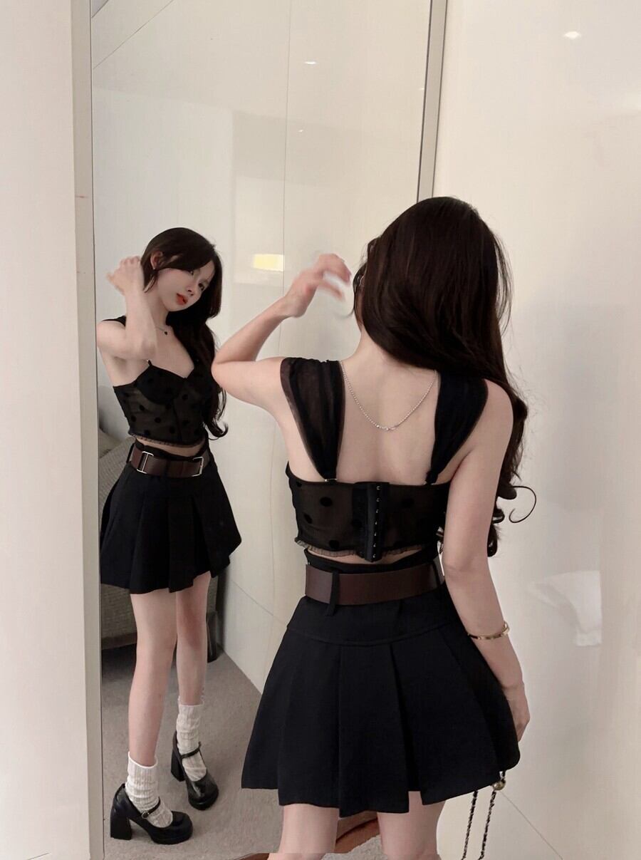 セクシーホットガールズスーツメッシュホルターストラップ胸パッドトップウエストスリムフィット多用途プリーツスカート 2 点セット